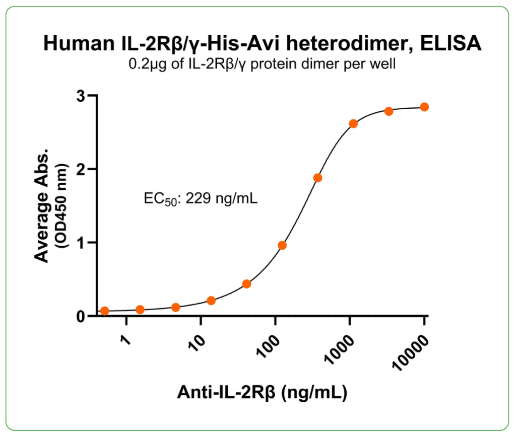 His-Avi Tag (Cat. No. CSP-24045-A1B5) at 2 μg/mL (100 μL/well) can bind anti-human IL-2Rβ monoclonal antibody with half maximal effective concentration (EC50) range of 114.7-458.8 ng/mL (QC tested).