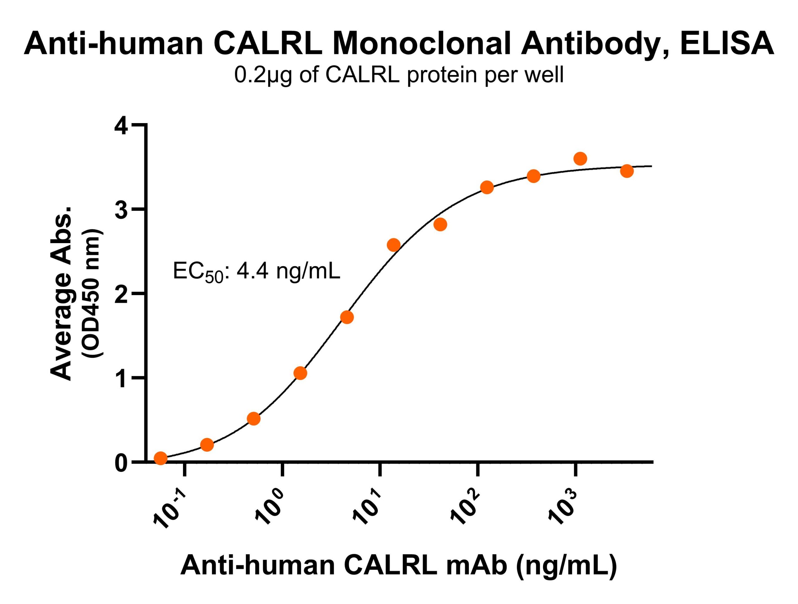 Immobilized human CALRL fragment at 2 μg/mL (100 μL/well) can bind Mouse Anti-Human CALRL Monoclonal Antibody (Cat. No. CABh-25327) with half maximal effective concentration (EC50) range of 2.2-8.8 ng/mL (QC tested).