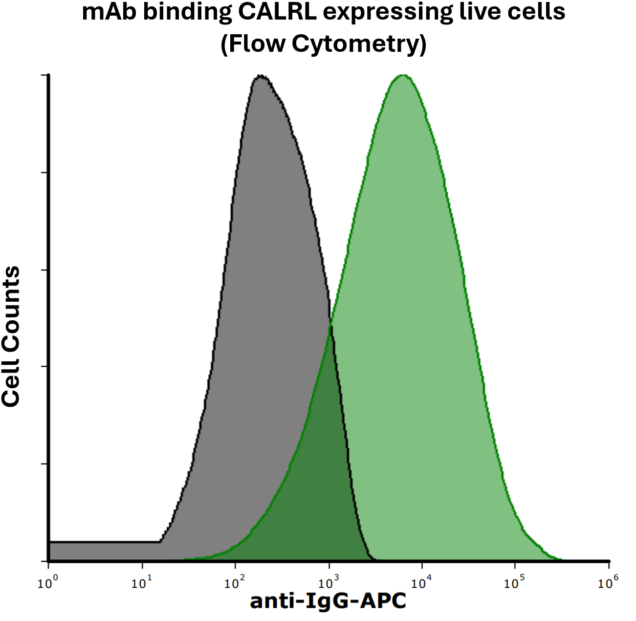 Detection of CALRL in HEK293 human cell line transiently transfected with human CALRL by Flow Cytometry. HEK293 cell line transfected with human CALRL was stained with isotype control (black curve) or Mouse Anti-Human CALRL Monoclonal Antibody (Cat. No. CABh-25327) (green curve) by APC-conjugated Anti-Mouse IgG Secondary Antibody.For Research Use Only (RUO)