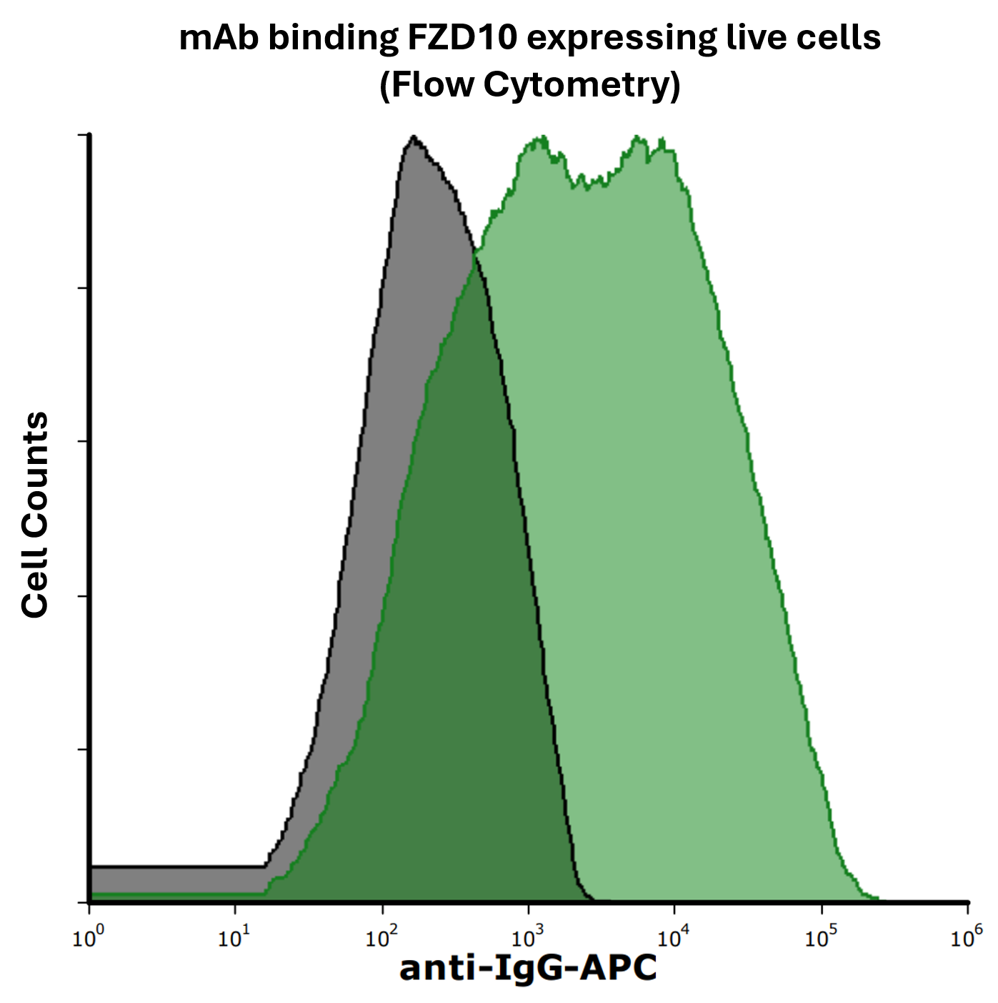 Detection of FZD10 in HEK293 human cell line transiently transfected with human FZD10 by Flow Cytometry. HEK293 cell line transfected with human FZD10 was stained with isotype control (black curve) or Mouse Anti-Human FZD10 Monoclonal Antibody (Cat. No. CABh-25330) (green curve) by APC-conjugated Anti-Mouse IgG Secondary Antibody.