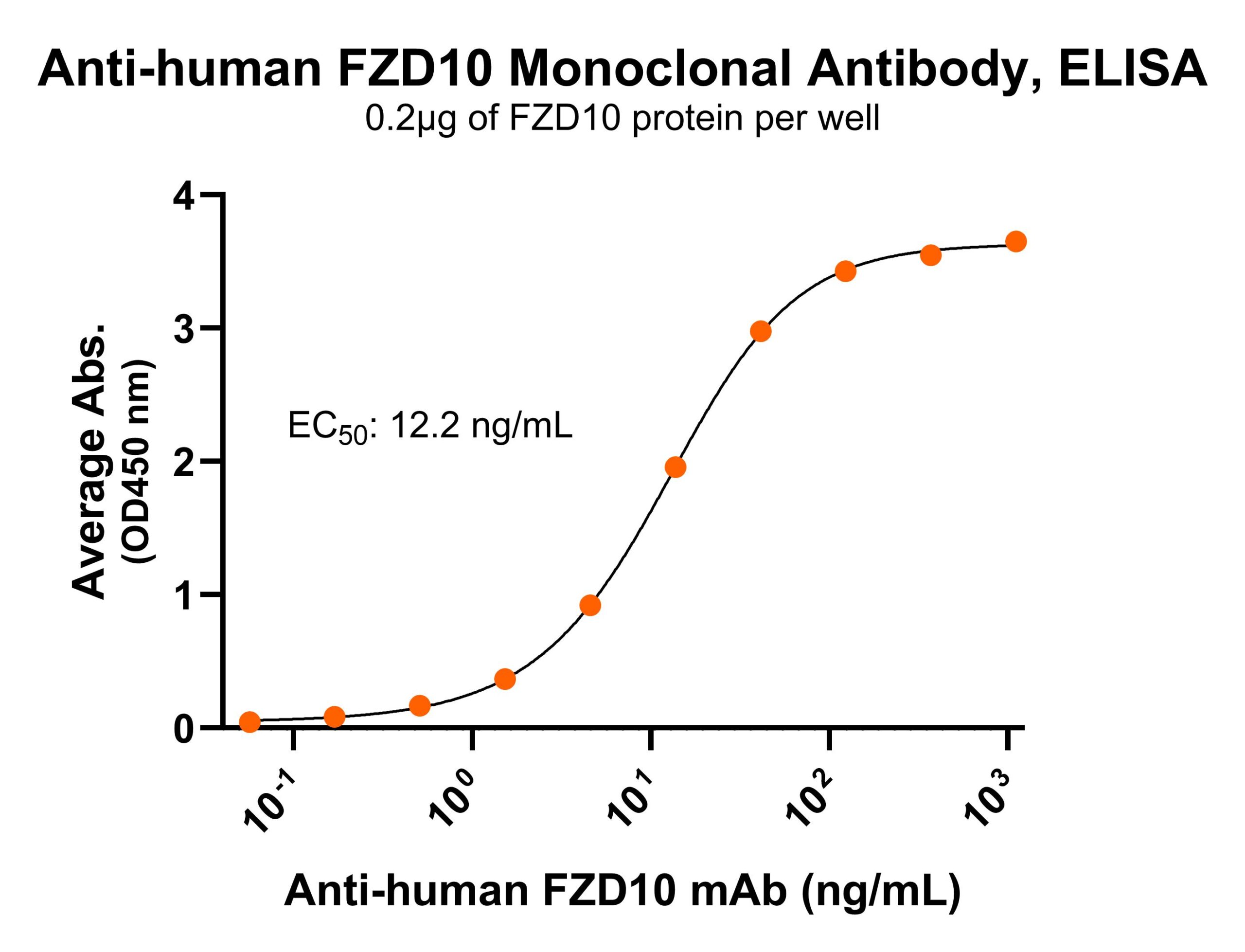 Immobilized human FZD10 fragment at 2 μg/mL (100 μL/well) can bind Mouse Anti-Human FZD10 Monoclonal Antibody (Cat. No. CABh-25330) with half maximal effective concentration (EC50) range of 6.1-24.4 ng/mL (QC tested).