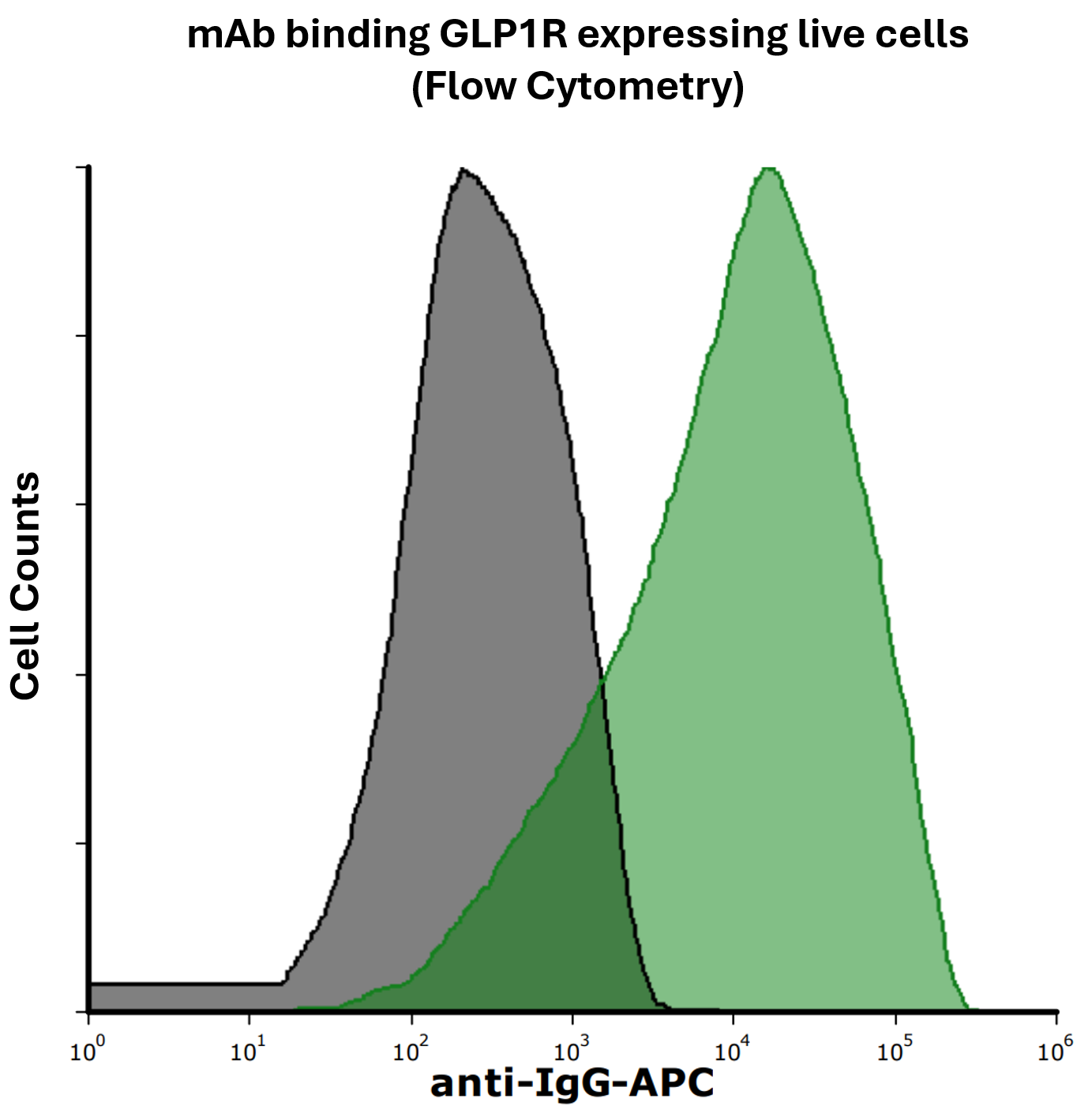 Detection of GLP1R in HEK293 human cell line transiently transfected with human GLP1R by Flow Cytometry. HEK293 cell line transfected with human GLP1R was stained with isotype control (black curve) or Mouse Anti-Human GLP1R Monoclonal Antibody (Cat. No. CABh-24034) (green curve) by APC-conjugated Anti-Mouse IgG Secondary Antibody.For Research Use Only (RUO)