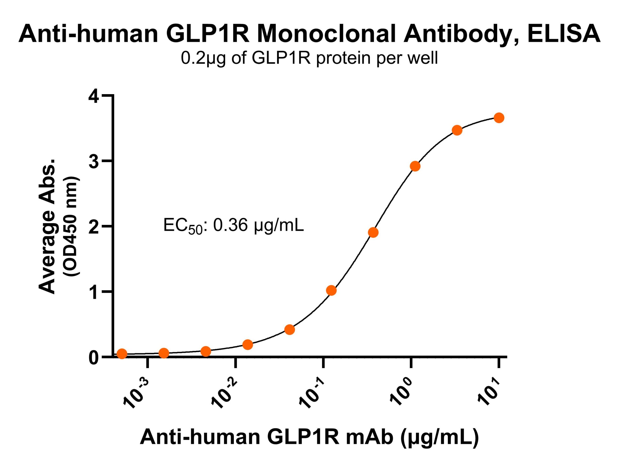 Immobilized human GLP1R fragment at 2 μg/mL (100 μL/well) can bind Mouse Anti-Human GLP1R Monoclonal Antibody (Cat. No. CABh-24034) with half maximal effective concentration (EC50) range of 0.2-0.7 μg/mL (QC tested).