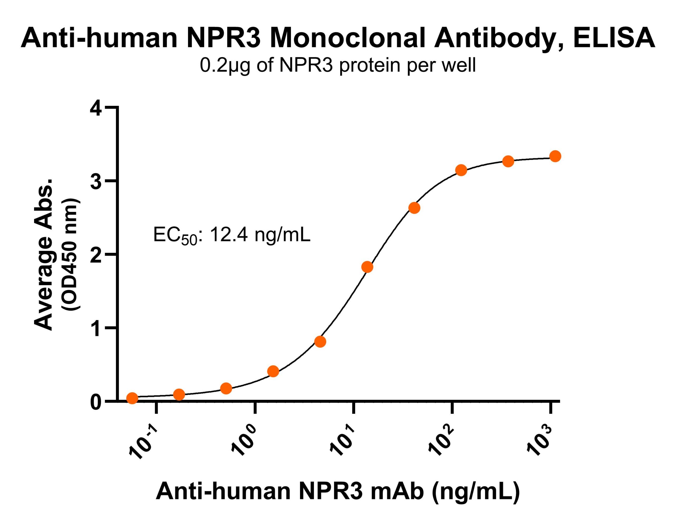 Immobilized human NPR3 fragment at 2 μg/mL (100 μL/well) can bind Mouse Anti-Human NPR3 Monoclonal Antibody (Cat. No. CABh-25373) with half maximal effective concentration (EC50) range of 6.2-24.8 ng/mL (QC tested).