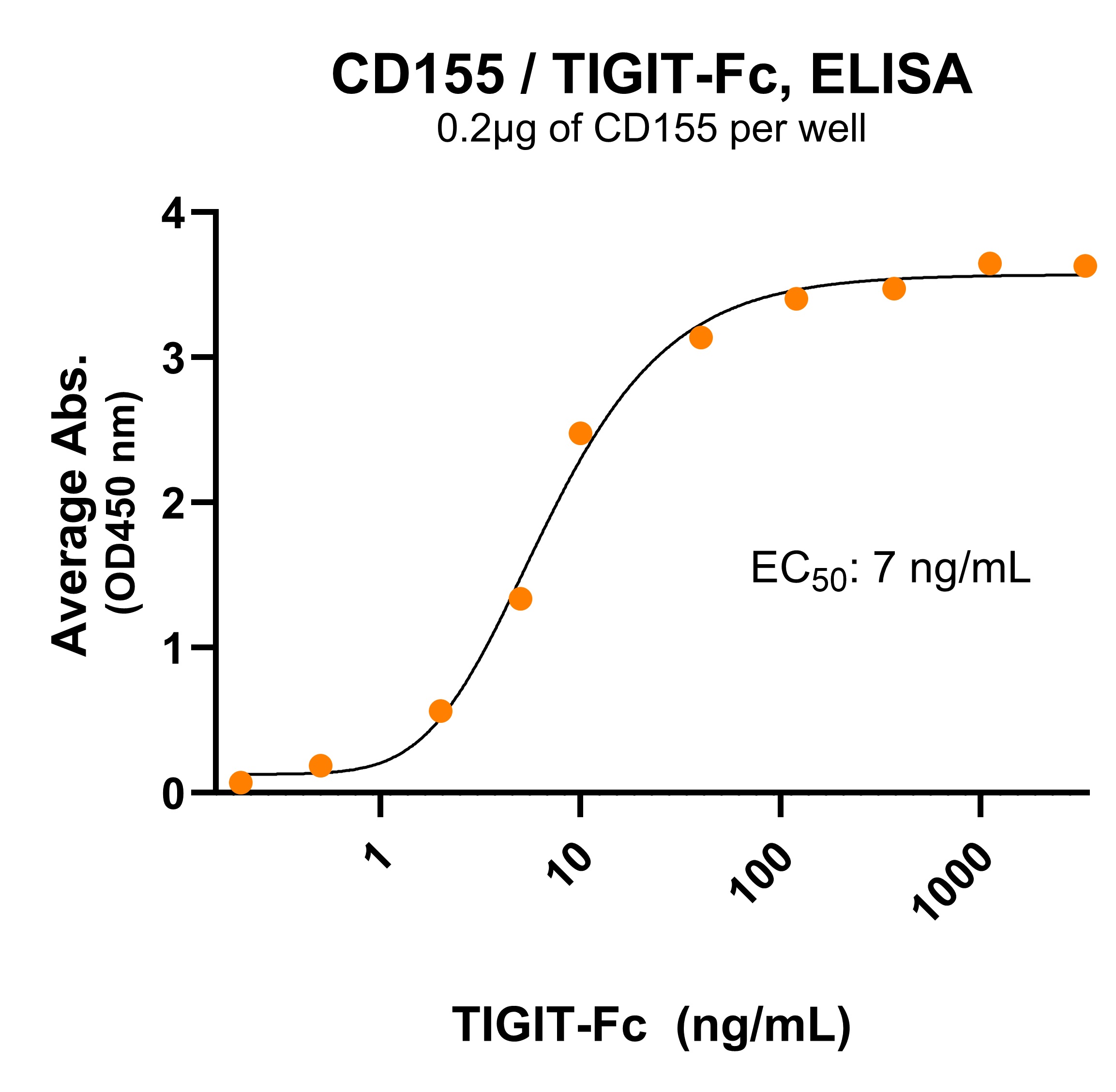 Immobilized human CD155 dimer protein, His Tag (Cat. No. CSP-24029) at 2 μg/mL (100 μL/well) can bind human TIGIT dimer protein, with half maximal effective concentration (EC50) range of 4-16.2 ng/mL (QC tested).For Research Use Only (RUO)
