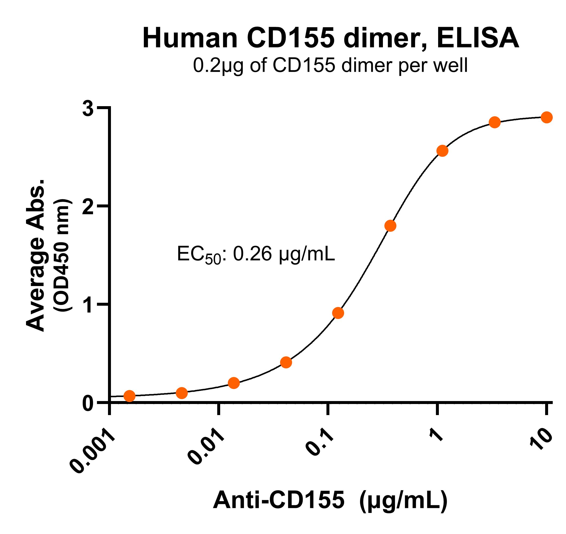 Immobilized human CD155 dimer protein, His Tag (Cat. No. CSP-24029) at 2 μg/mL (100 μL/well) can bind anti-human CD155 monoclonal antibody with half maximal effective concentration (EC50) range of 0.21-0.83 μg/mL (QC tested).