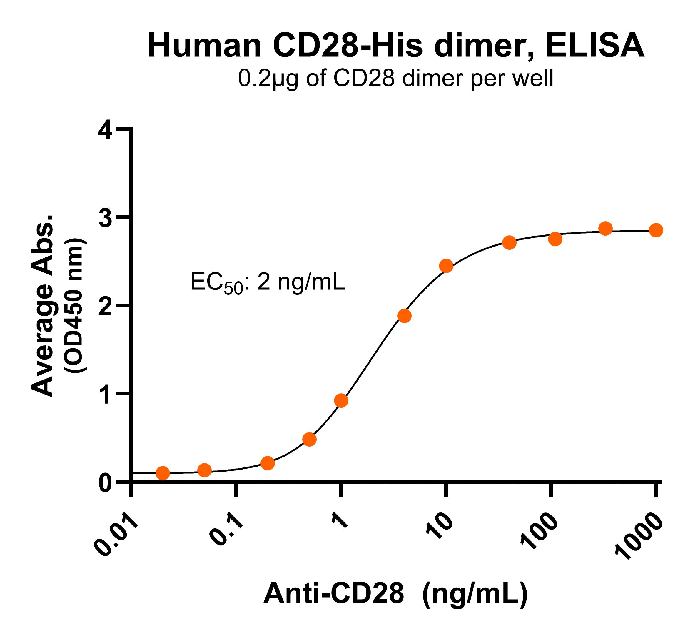 Immobilized human CD28 dimer protein, His Tag (Cat. No. CSP-24032) at 2 μg/mL (100 μL/well) can bind anti-human CD28 monoclonal antibody, with half maximal effective concentration (EC50) range of 1.1-4.3 ng/mL (QC tested).