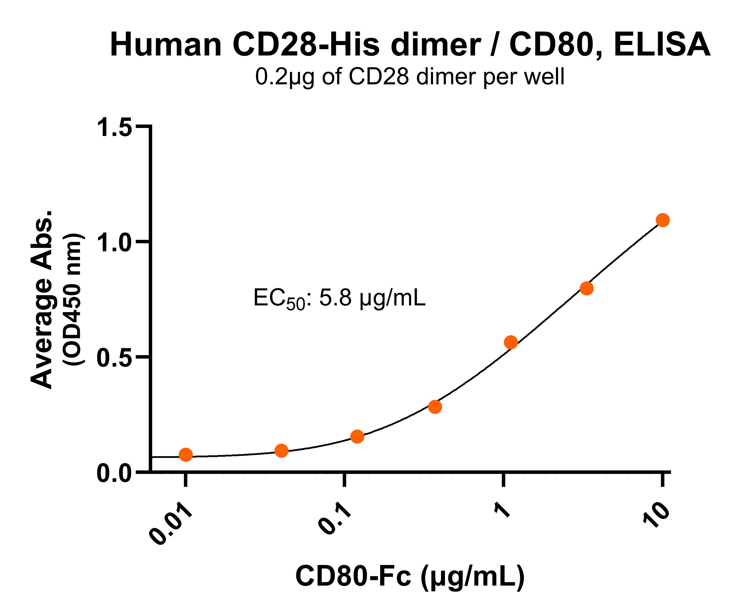 Immobilized human CD28 dimer protein, His Tag (Cat. No. CSP-24032) at 2 μg/mL (100 μL/well) can bind human CD80 dimer protein (Cat. No. CSP-24033-04), with half maximal effective concentration (EC50) range of 2.9-11.7 μg/mL (QC tested).For Research Use Only (RUO)