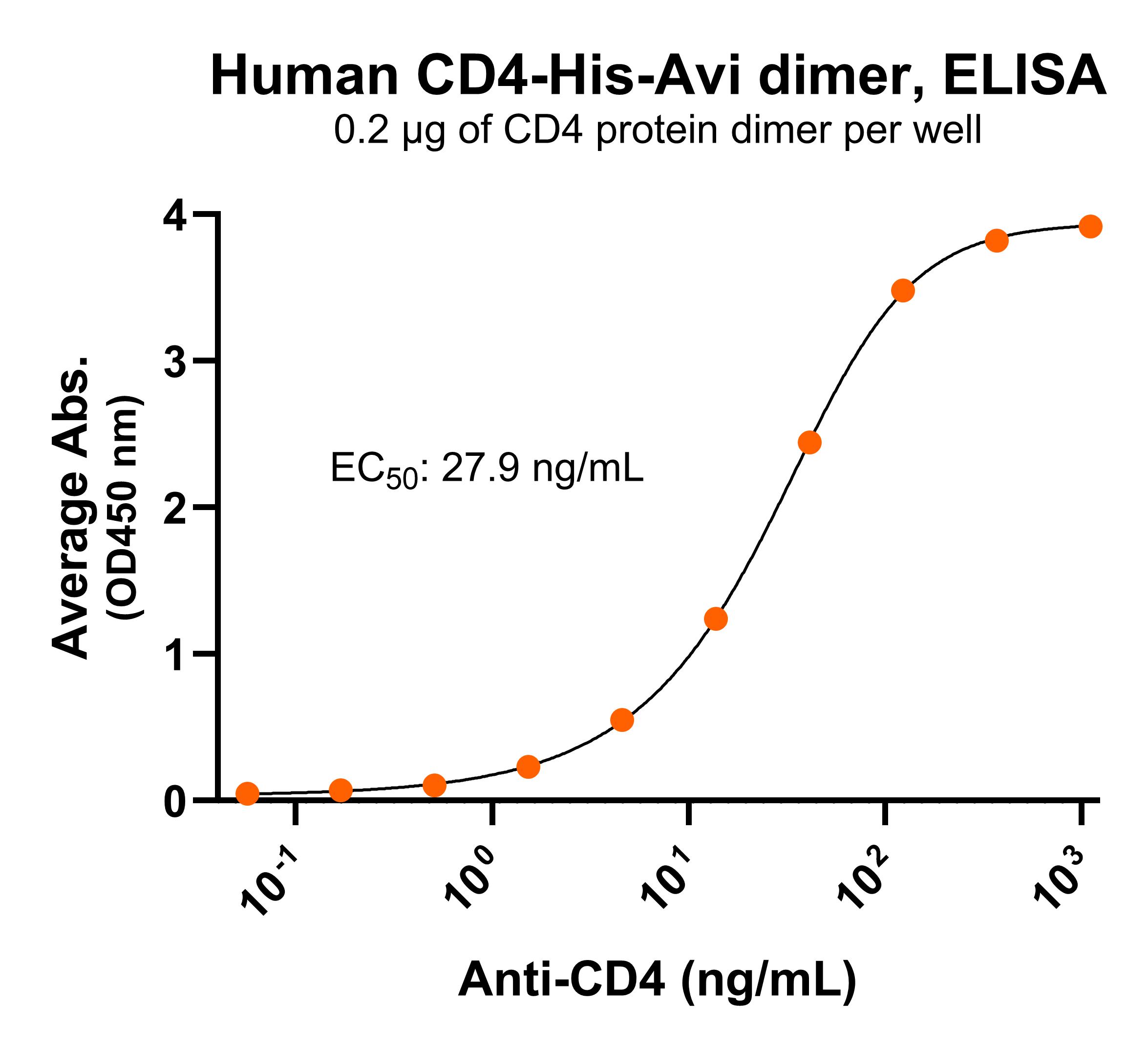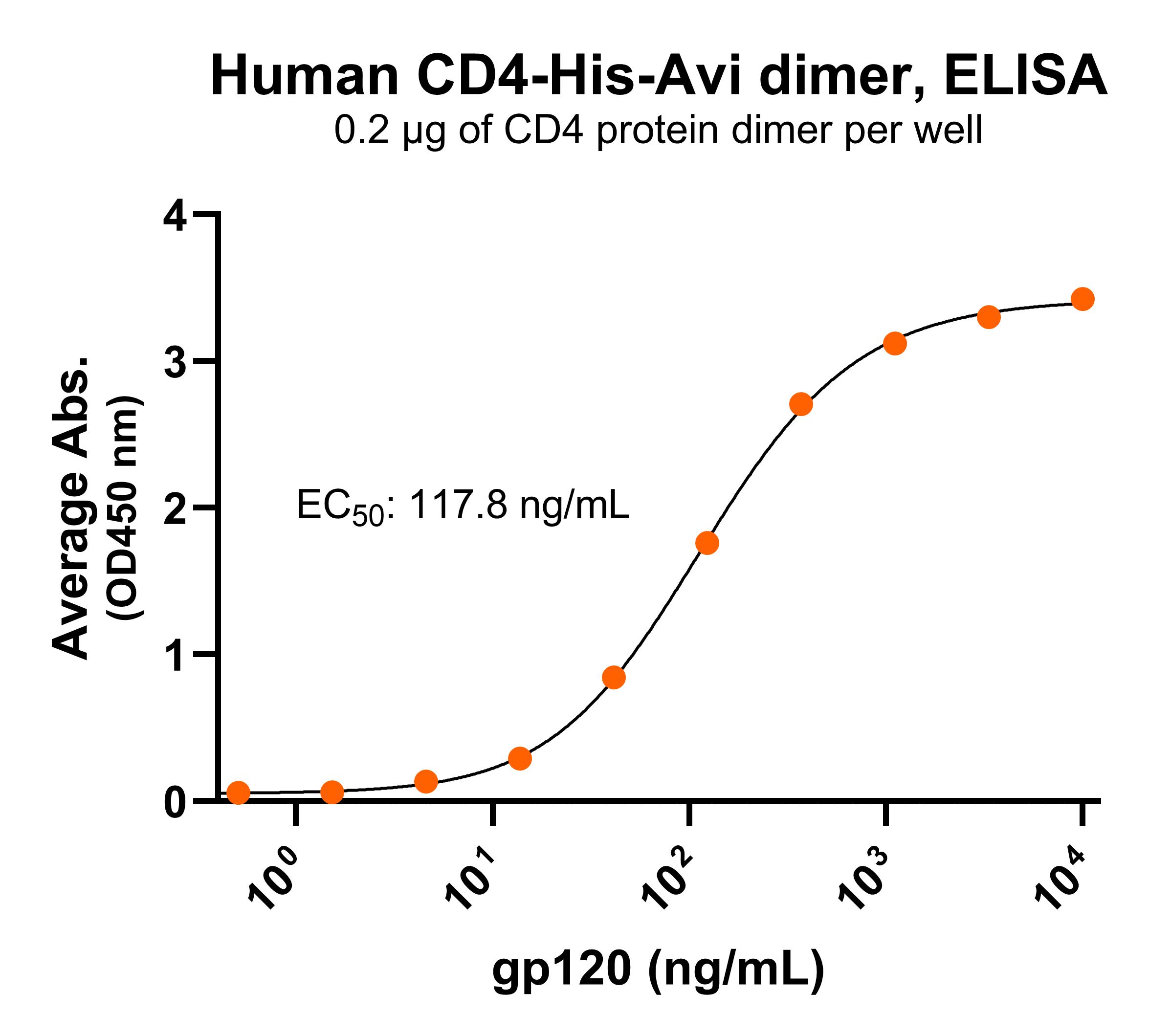 Human CD4 protein is also known as IL16 receptor (IL16R). CD4 dimer (CSP-24004-03) contains CD4 extracellular 4-domains (amino acids Lys26-Phe396, UniProt# A0A4Y5UGE4) with a homodimer motif and a tandem His-Avi tag at the C-terminus which makes it ready for biotinylation. This protein is expressed in HEK293 cells. The CD4 dimer protein is bioactive and can bind to HIV-1 envelope glycoproteins (Env) from various subtypes with on average >10 fold binding activity increases compared to CD4 monomer protein. The HIV-1 Env binding to CD4 dimer can be diminished by a D368R mutation. CD4 dimer also increases the binding to CD4-specific antibodies. This CD4 dimer can be used as an immunogen for animal immunization (RUO) and as an antigen for in vitro assays and antibody screening targeting more conformations epitopes.