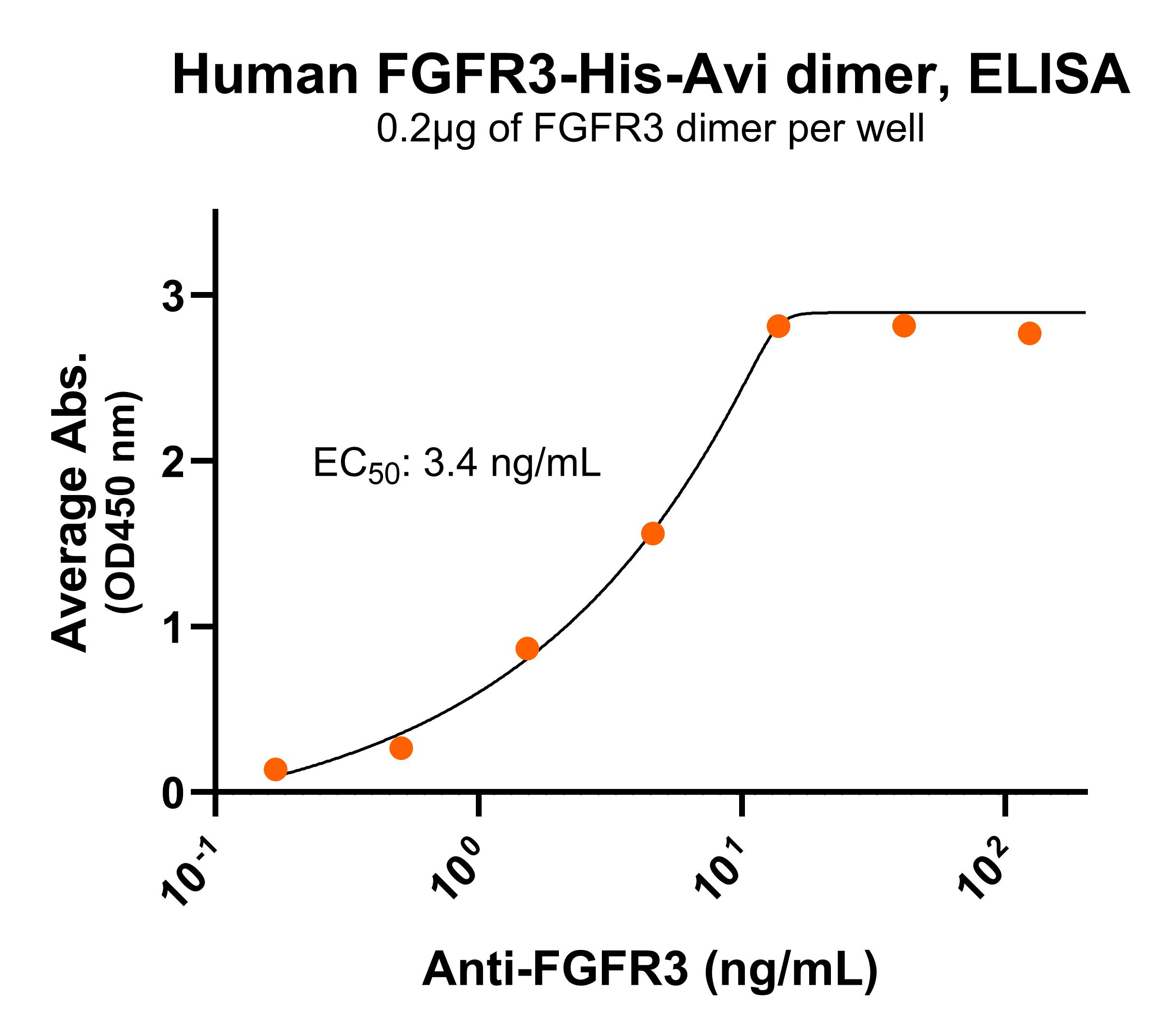 Immobilized human FGFR3-His-Avi protein dimer (CSP-25131-03) at 2 μg/mL (100 μL/well) can bind anti-human FGFR3 monoclonal antibody with half maximal effective concentration (EC50) range of 1.7-6.7 ng/mL (QC tested).