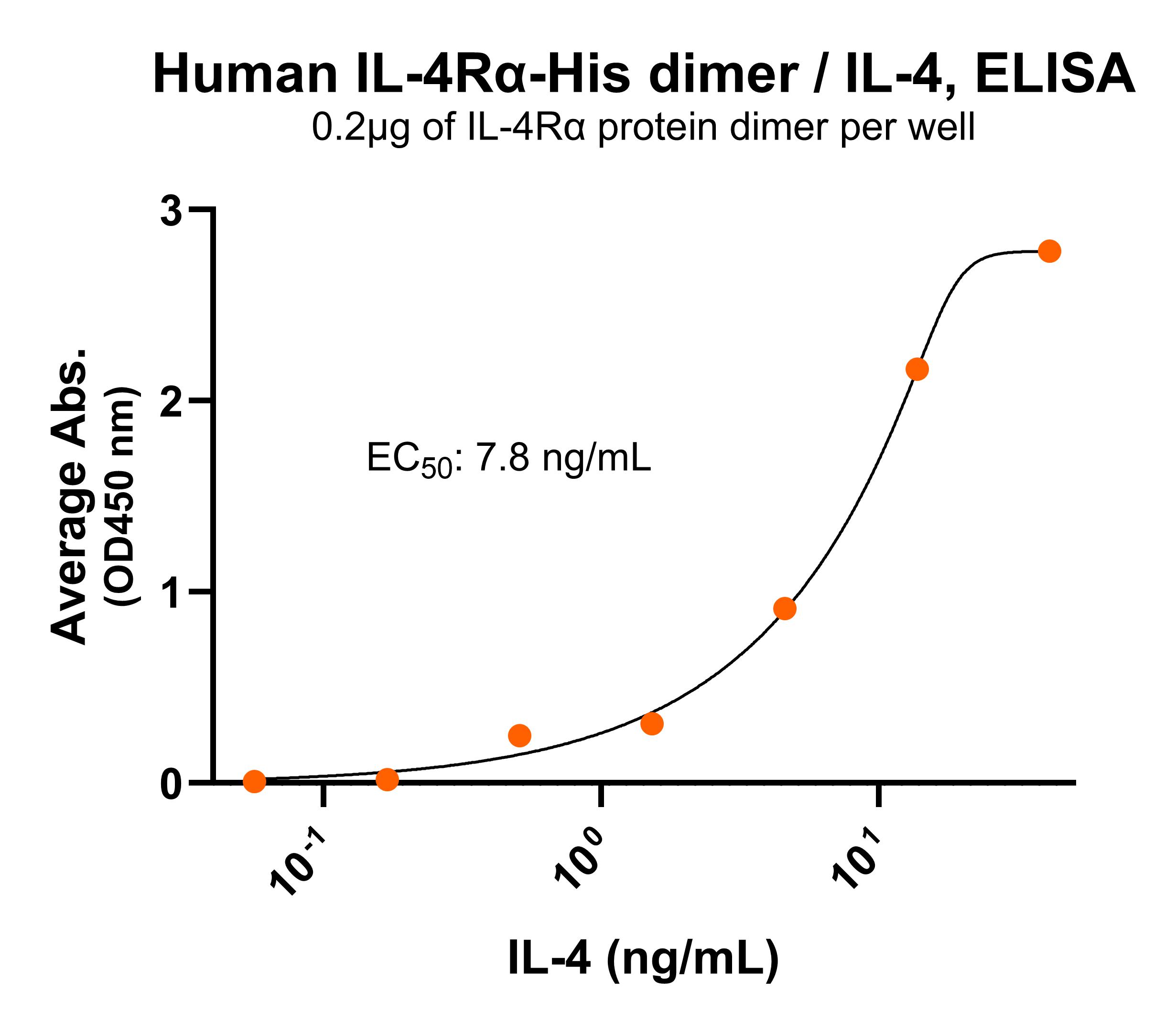 Immobilized human IL-4Rα protein dimer, His-tag (CSP-25219-01) at 2 μg/mL (100 μL/well) can bind human IL-4 with half maximal effective concentration (EC50) range of 3.9-15.6 ng/mL (QC tested).For Research Use Only (RUO)