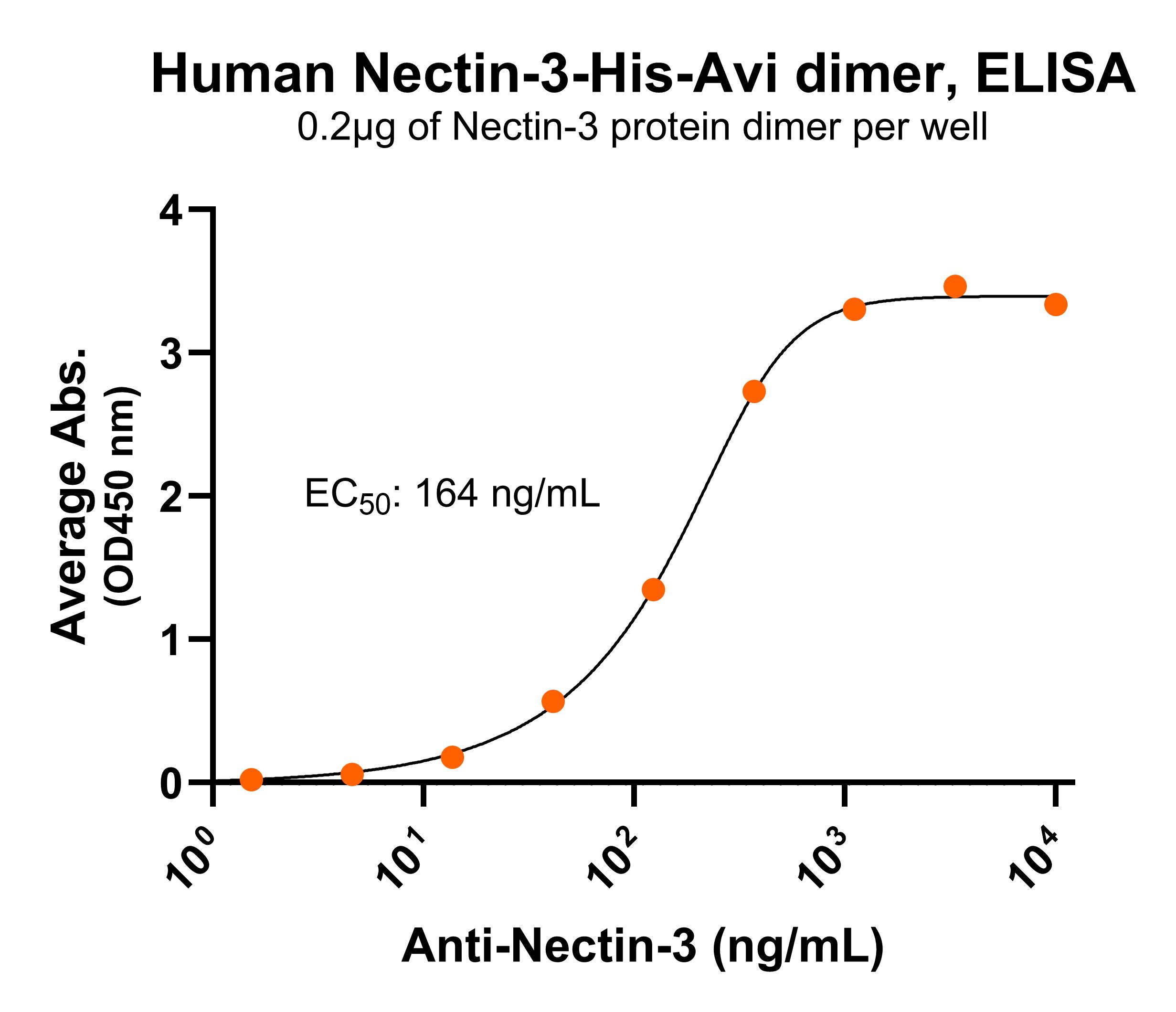 Immobilized human Nectin-3 protein dimer, His-Avi tag (Cat. No. CSP-25196-03) at 2 μg/mL (100 μL/well) can bind anti-human Nectin-3 monoclonal antibody with half maximal effective concentration (EC50) range of 82-327.8 ng/mL (QC tested).