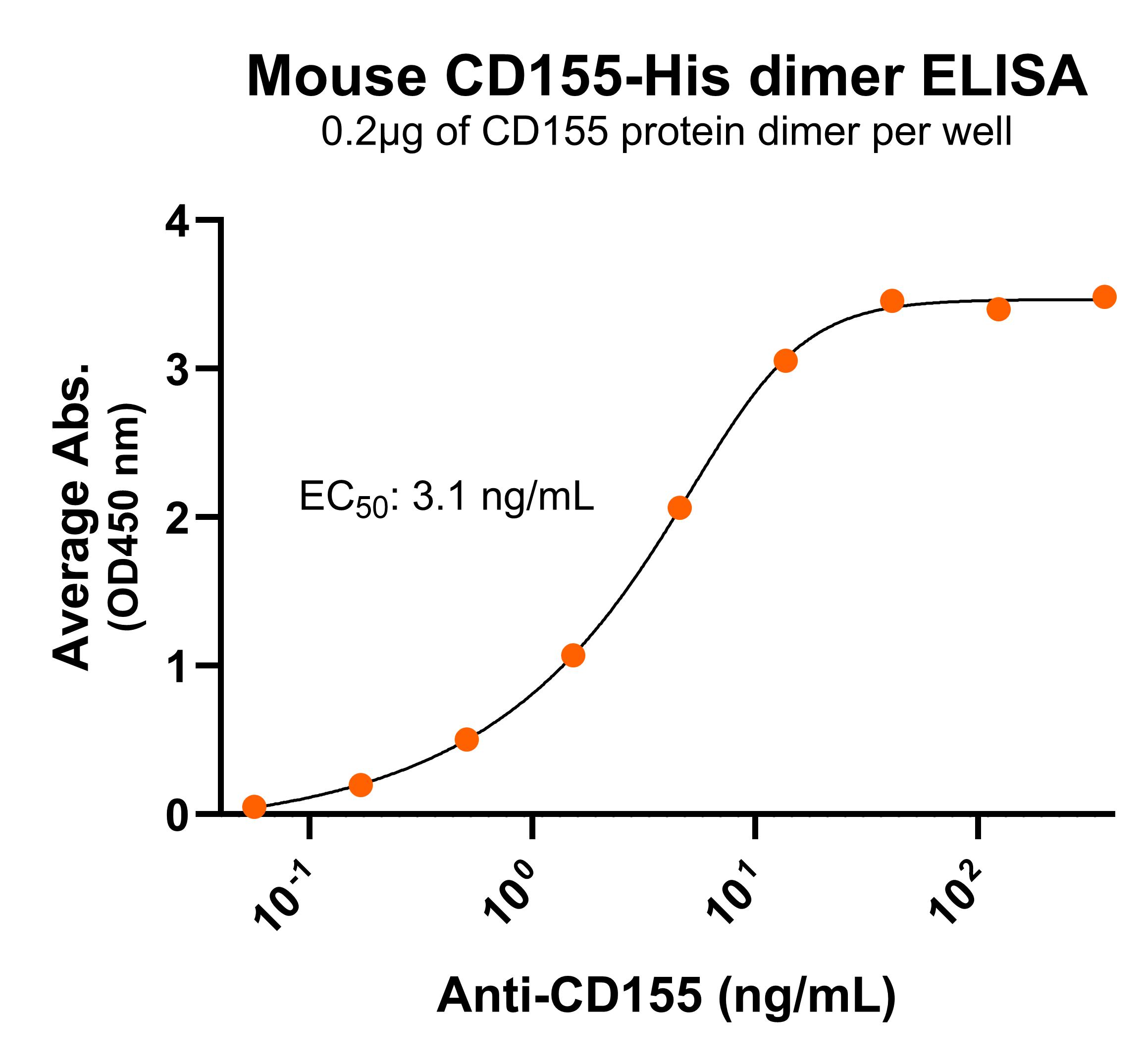 Immobilized mouse CD155 protein dimer, His Tag (Cat. No. CSP-25184-01) at 2 μg/mL (100 μL/well) can bind anti-mouse CD155 monoclonal antibody with half maximal effective concentration (EC50) range of 1.6-6.3 ng/mL (QC tested).
