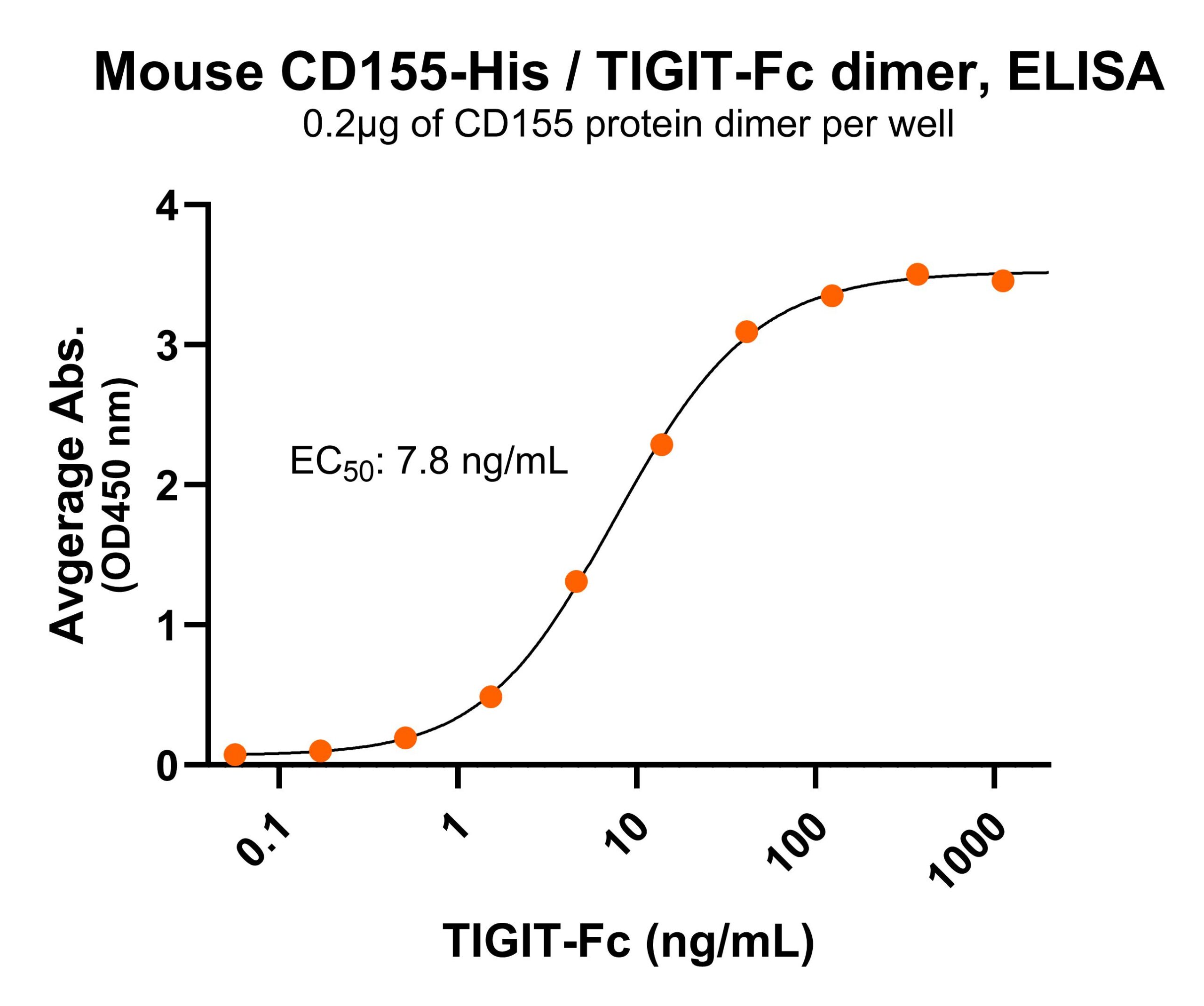 Immobilized mouse CD155 protein dimer, His Tag (Cat. No. CSP-25184-01) at 2 μg/mL (100 μL/well) can bind mouse TIGIT dimer protein, Fc Tag (Cat. No. CSP-25182-04) with half maximal effective concentration (EC50) range of 3.9-15.6 ng/mL (QC tested).