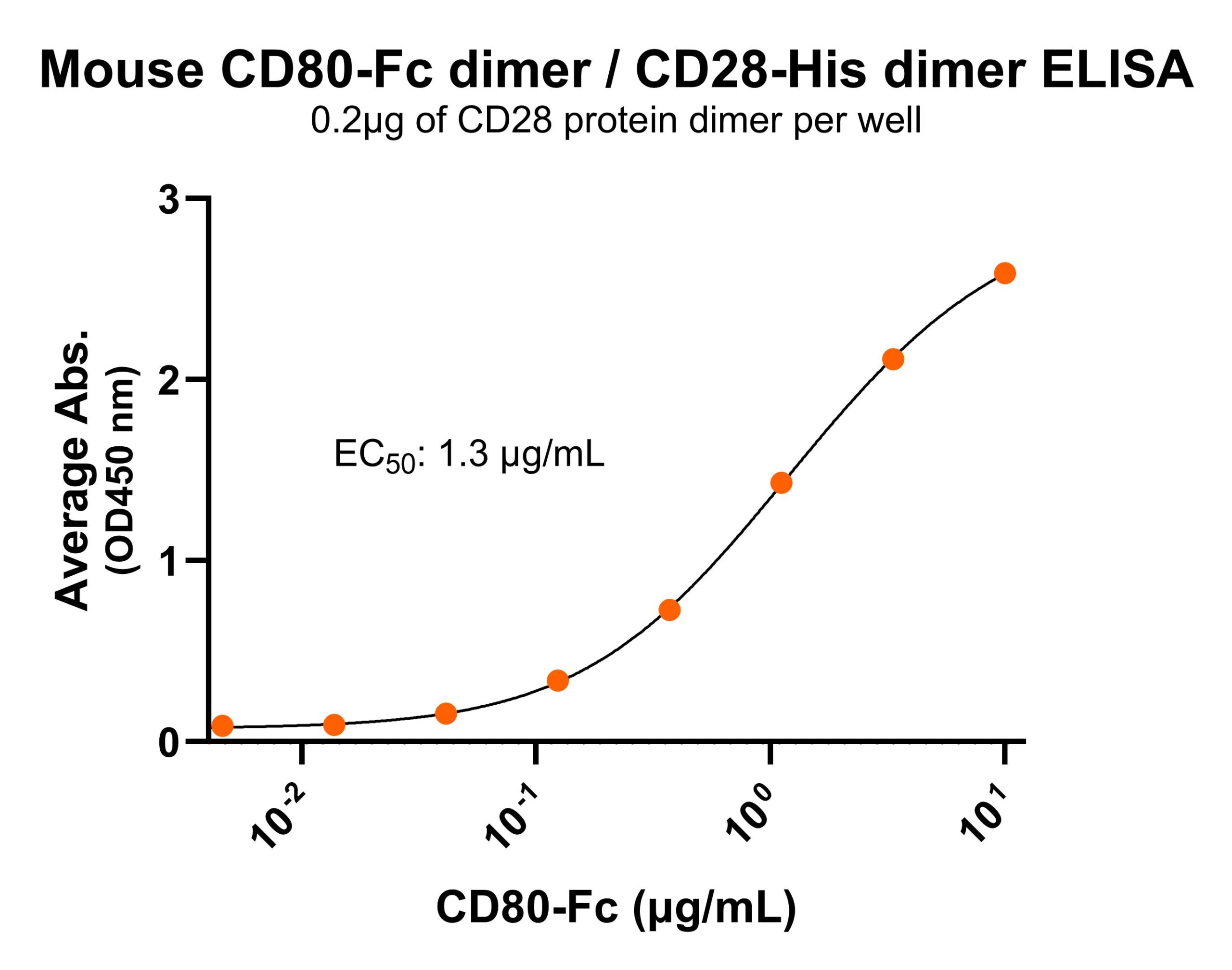 Immobilized mouse CD28 protein dimer, His Tag (CSP-25186-01 at 2 μg/mL (100 μL/well) can bind mouse CD80 protein dimer, Fc Tag (Cat. No. CSP-25187-04), with half maximal effective concentration (EC50) range of 0.6-2.6 μg/mL (QC tested).