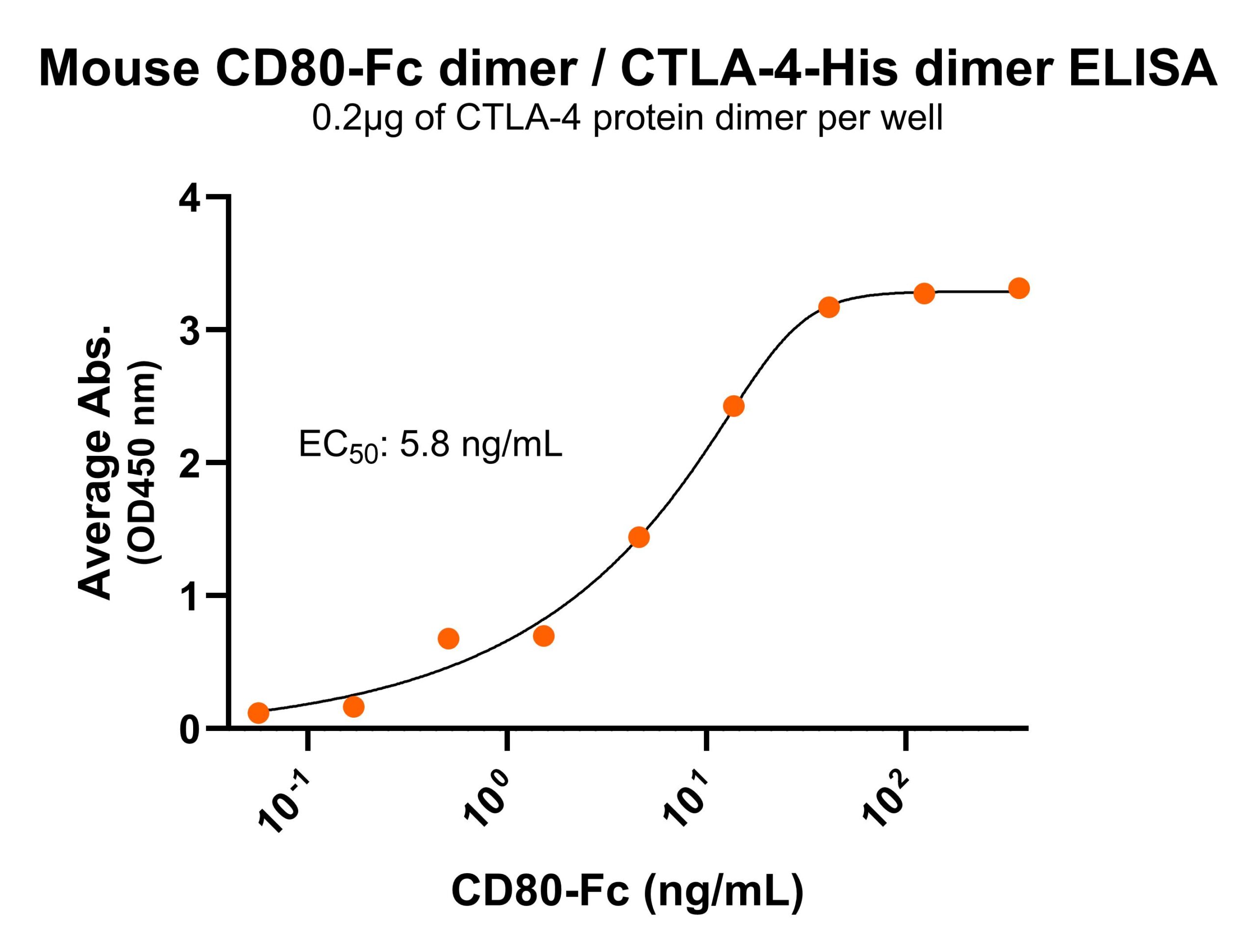 Immobilized mouse CTLA-4 protein dimer, His Tag (CSP-25185-01) at 2 μg/mL (100 μL/well) can bind mouse CD80 protein dimer, Fc Tag (Cat. No. CSP-25187-04), with half maximal effective concentration (EC50) range of 2.9-11.7 ng/mL (QC tested).