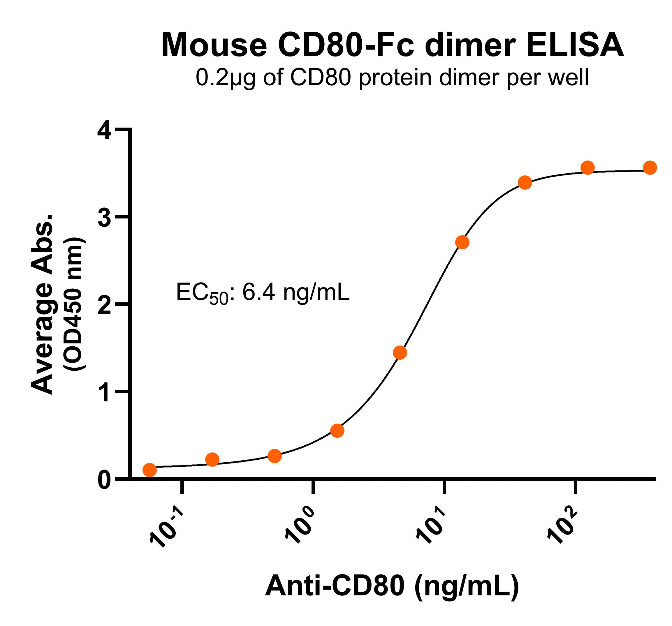 Immobilized mouse CD80 protein dimer, Fc Tag (Cat. No. CSP-25187-04) at 2 μg/mL (100 μL/well) can bind anti-mouse CD80 monoclonal antibody with half maximal effective concentration (EC50) range of 3.2-12.9ng/mL (QC tested).