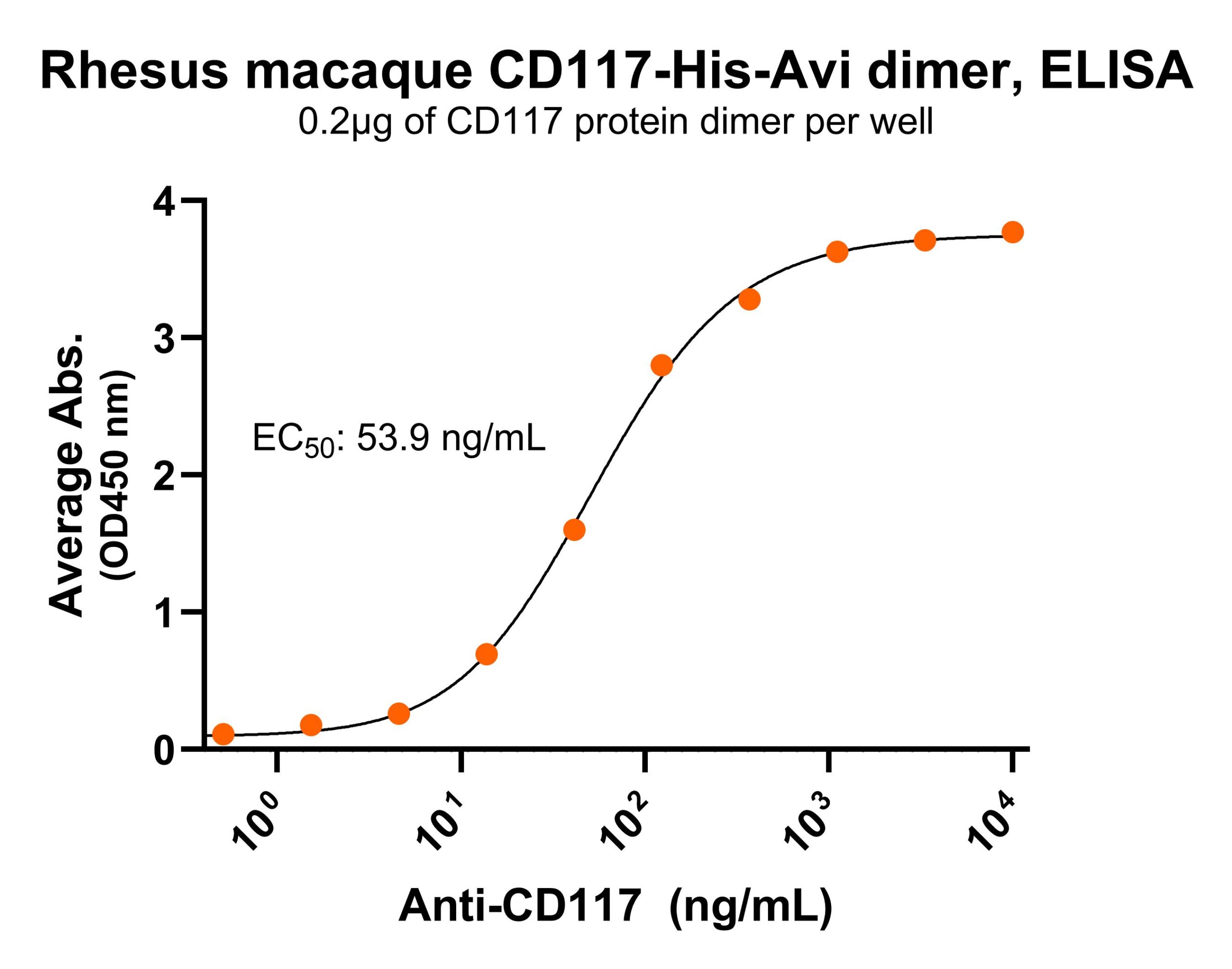 Immobilized Rhesus macaque CD117 protein dimer, His-Avi Tag (Cat. No. CSP-25194-03) at 2 μg/mL (100 μL/well) can bind anti-non-human primate CD117 polyclonal antibody, with half maximal effective concentration (EC50) range of 27-107.8 ng/mL (QC tested).