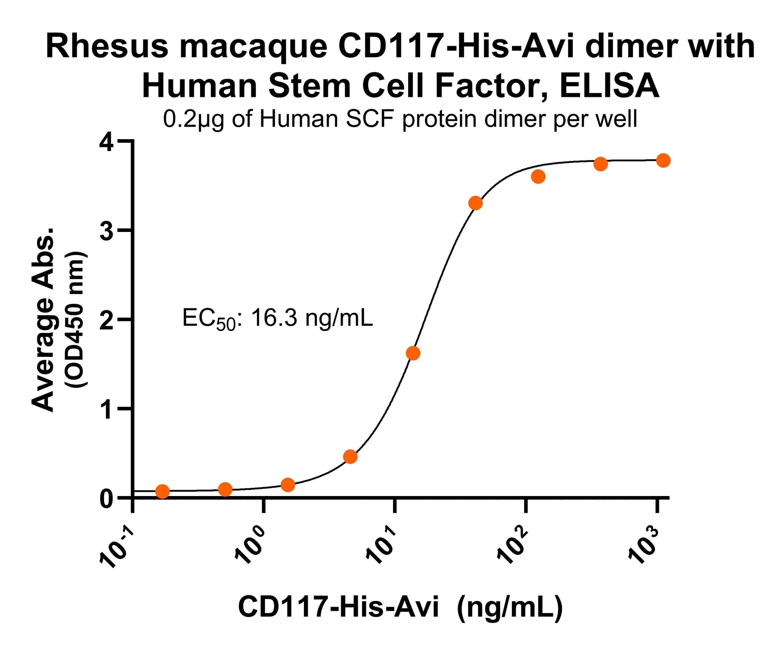 Immobilized human stem cell factor (SCF) at 2 μg/mL (100 μL/well) can bind Rhesus macaque CD117 protein dimer, His-Avi Tag (Cat. No. CSP-25194-03) with half maximal effective concentration (EC50) range of 8.1-32.5 ng/mL (QC tested).For Research Use Only (RUO)