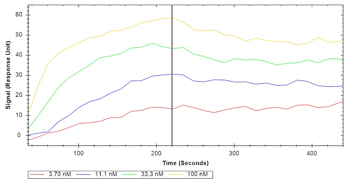 Immobilized Rhesus macaque TIGIT protein dimer, His tag (Cat. No. CSP-25298-01) can bind Rhesus macaque PVR protein dimer, His tag (Cat. No. CSP-25297-01) with a KD of 0.5-1.9 nM as determined by LSPR (Nicoya Alto).For Research Use Only (RUO)