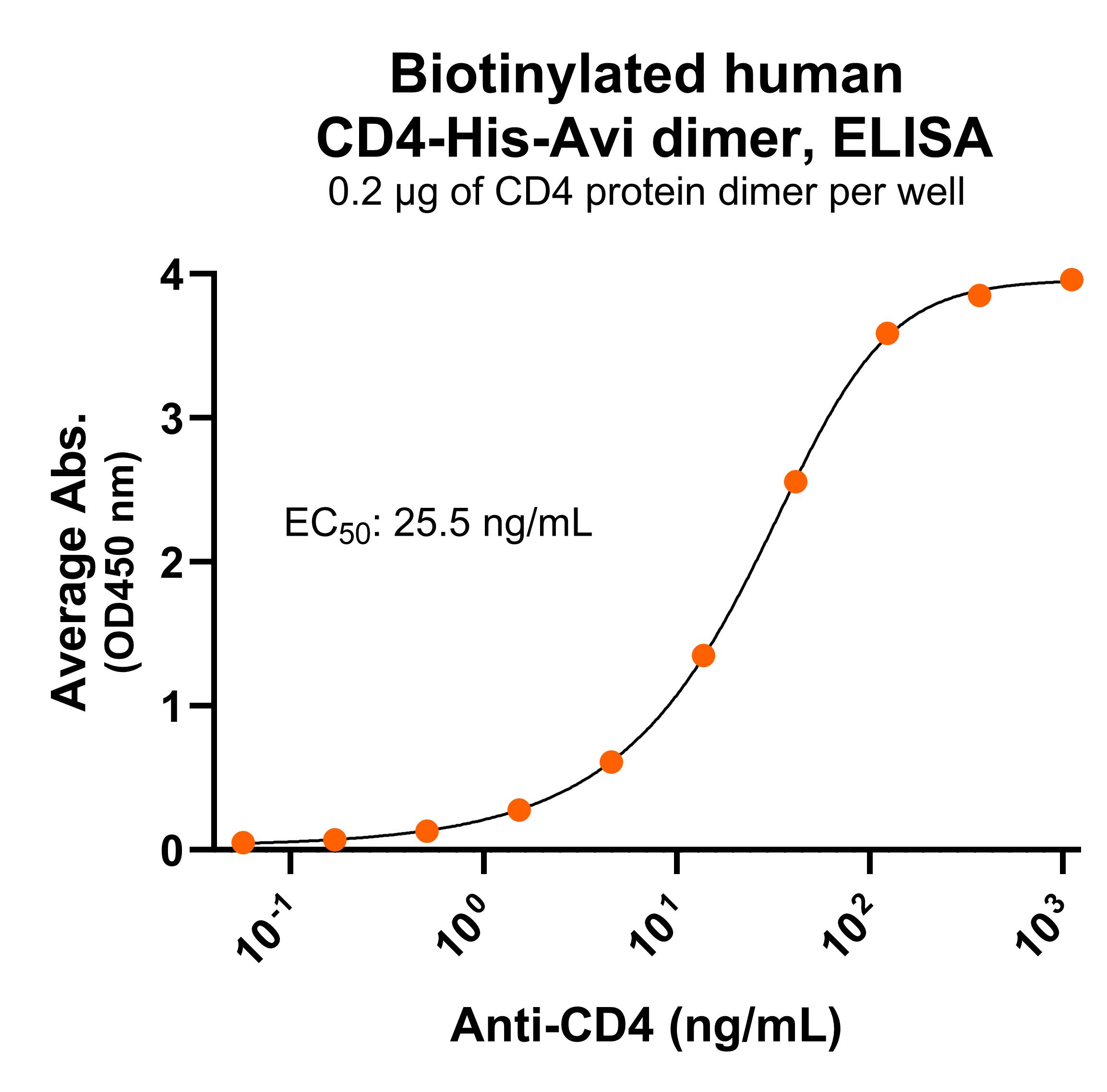 Immobilized biotinylated human CD4 protein dimer, His-Avi Tag (Cat. No. BCSP-24004-03) at 2 μg/mL (100 μL/well) can bind anti-human CD4 monoclonal antibody with half maximal effective concentration (EC50) range of 12.8-51 ng/mL (QC tested).