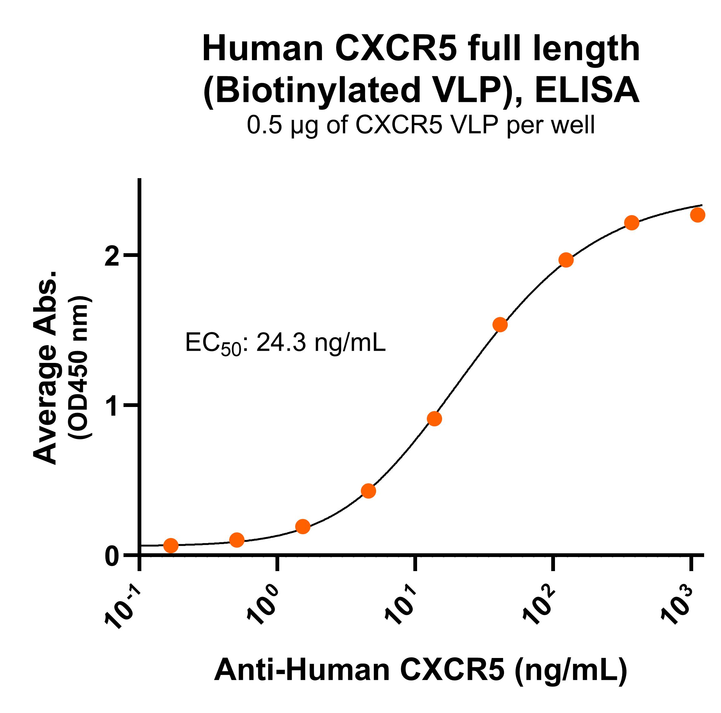 Protein Construct: The human CXCR5 full length protein, mimics the native protein conformation on the cell surface displayed on Virus-Like Particlesbiotinylated with biotin on a 22.4 Å spacer arm.