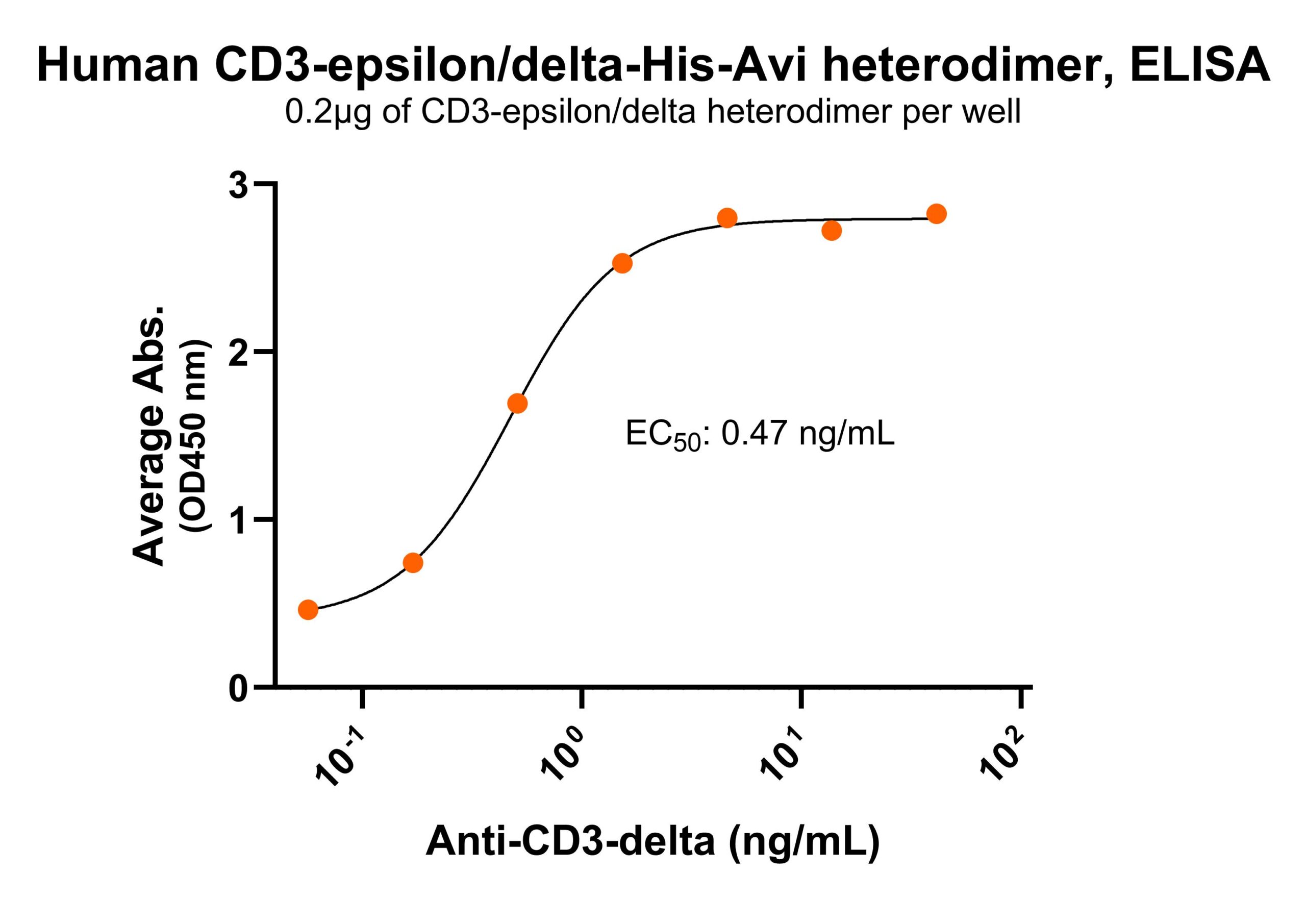 Immobilized human CD3-epsilon/delta protein dimer, His-Avi Tag (Cat. No. CSP-24043-A1B5) at 2 μg/mL (100 μL/well) can bind anti-human CD3-delta monoclonal antibody, with half maximal effective concentration (EC50) range of 0.2-0.9 ng/mL (QC tested).For Research Use Only (RUO)