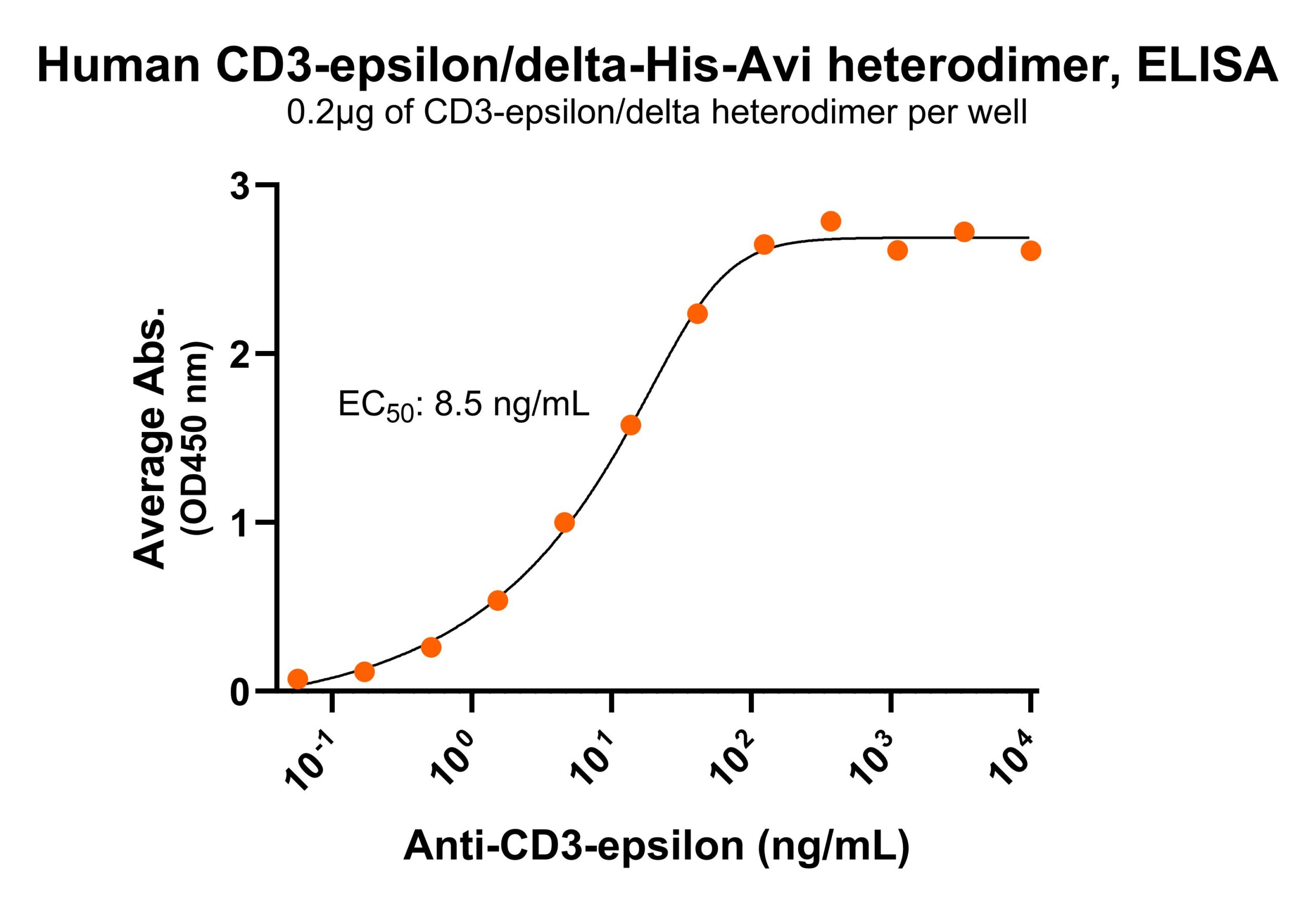 Immobilized human CD3-epsilon/delta protein dimer, His-Avi Tag (Cat. No. CSP-24043-A1B5) at 2 μg/mL (100 μL/well) can bind anti-human CD3-epsilon monoclonal antibody, with half maximal effective concentration (EC50) range of 4.2-16.9 ng/mL (QC tested).