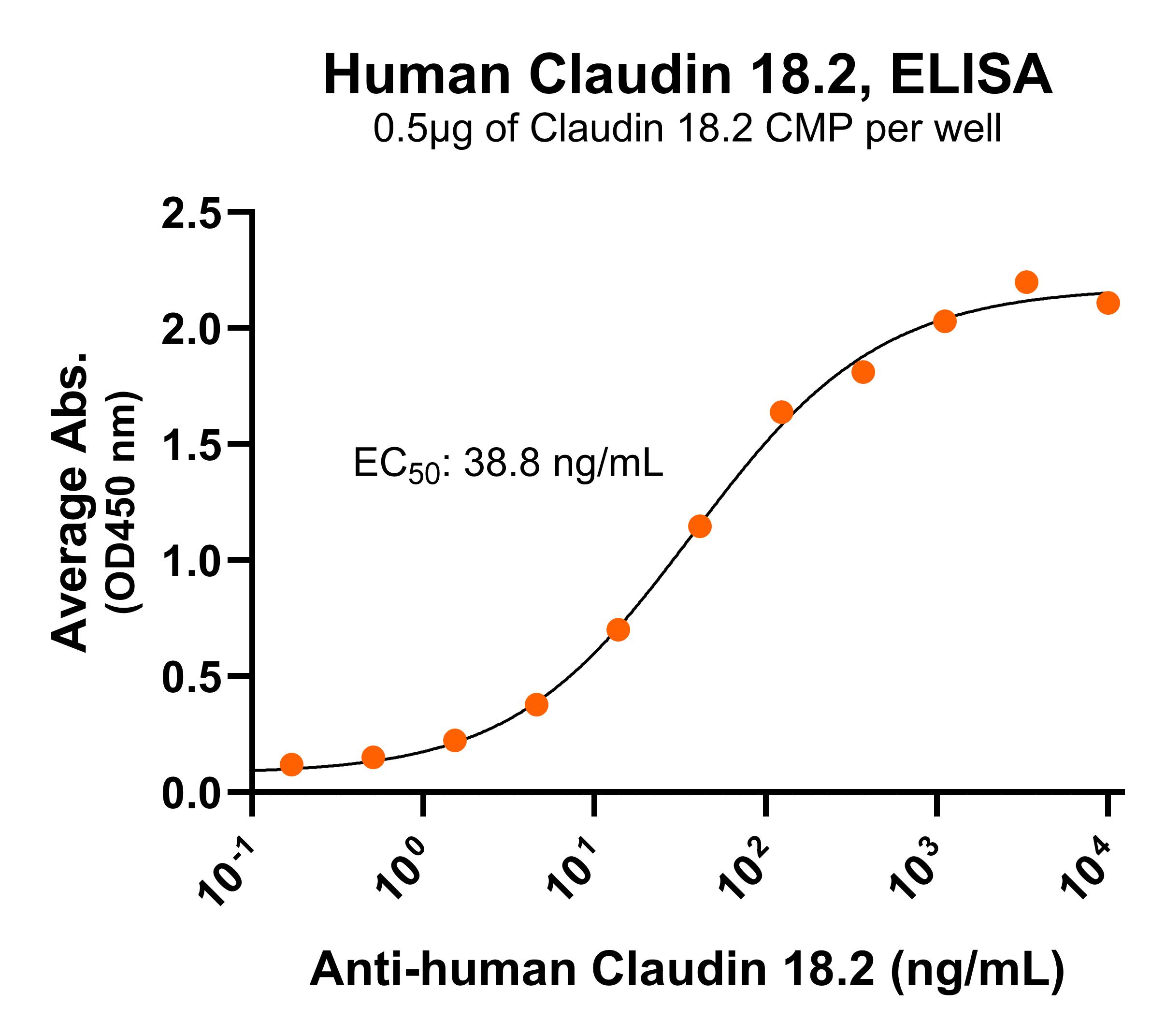 Claudin 18.2, also known as Claudin-18.2, CLDN18.2, SFTA5, and SFTPJ is an integral membrane protein with 4 transmembrane domains, two extracellular loops, one intracellular loop, and both the N-terminus and C-terminus ends towards the cytosol. Human Claudin 18.2 is a member of the Claudin protein family and is involved in tight junctions and cell-to-cell adhesion. Claudin 18.2 is over-expressed on various tumor cells including gastric cancer and pancreatic cancer, and plays a critical role in cancer initiation and progression. Claudin 18.2 is a promising target for cancer therapeutics.