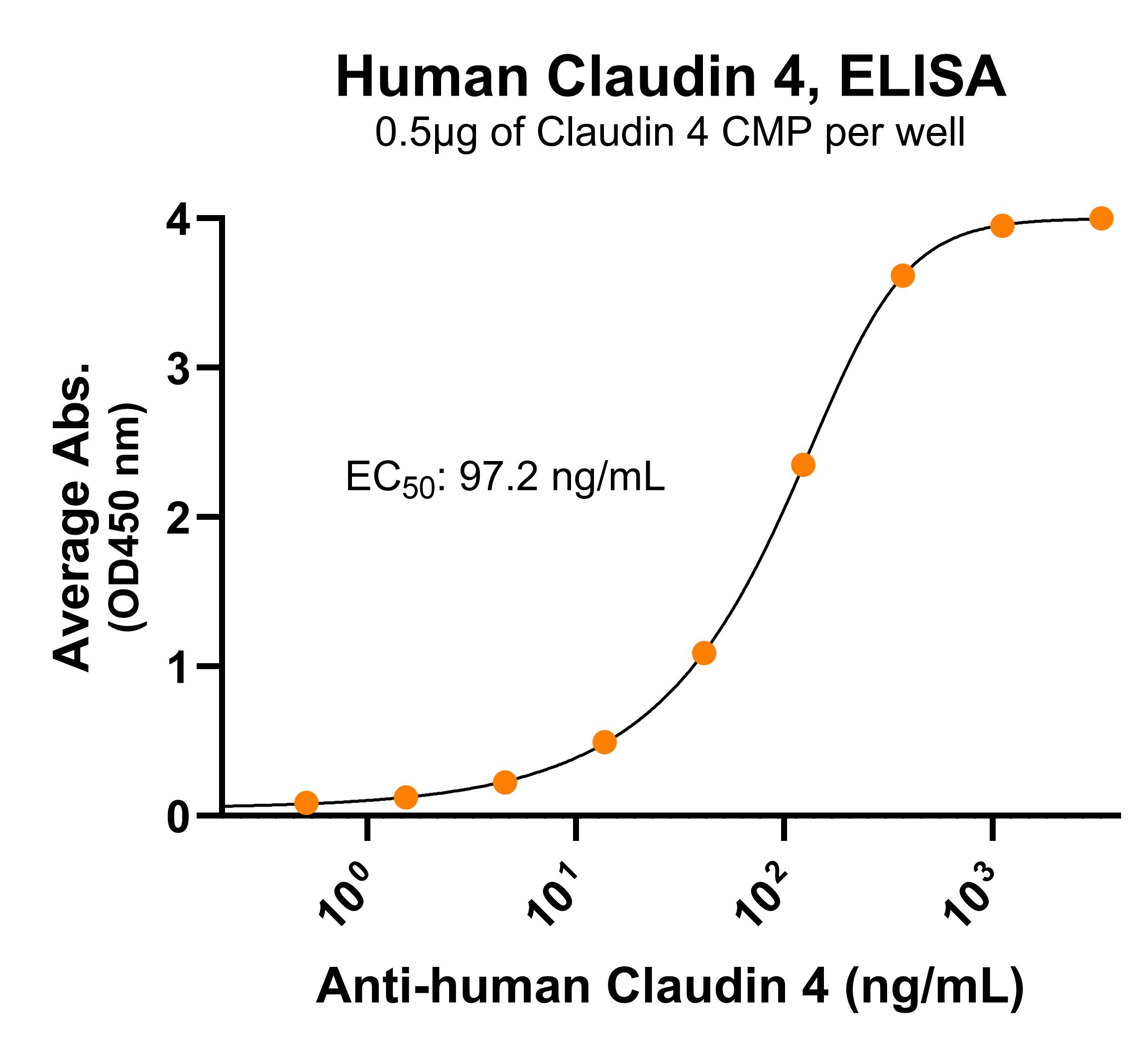 Immobilized human Claudin 4 VLP (Cat. No. CMP-24006) at 5 μg/mL (100 μL/well) can bind monoclonal anti-human Claudin 4 antibody with half maximal effective concentration (EC50) range of 48.6-194.4 ng/mL (QC tested).