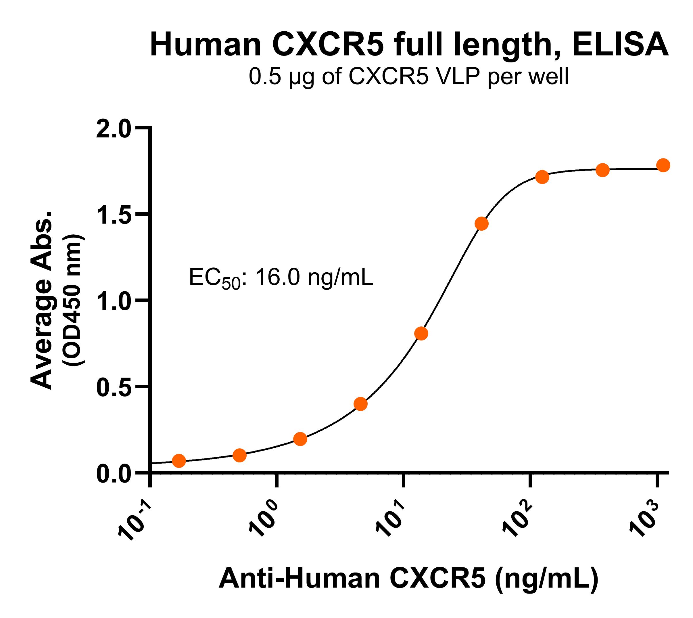 Immobilized human CXCR5 VLP (Cat. No. CMP-24014) at 5 μg/mL (100 μL/well) can bind monoclonal anti-human CXCR5 antibody with half maximal effective concentration (EC50) range of 7.5-30 ng/mL (QC tested).