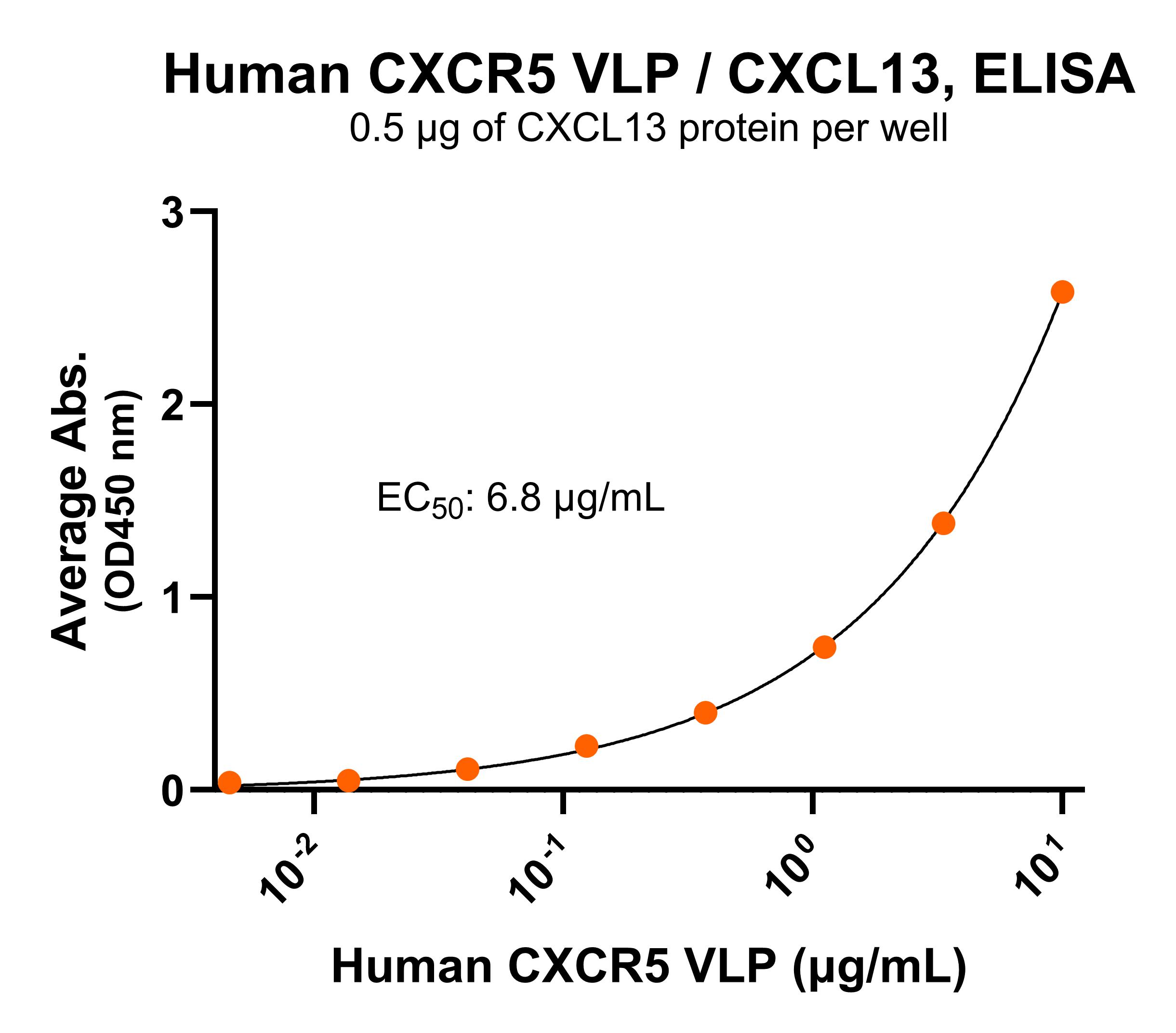 Immobilized human CXCL13 at 5 μg/mL (100 μL/well) can bind human CXCR5 VLP (Cat. No. CMP-24014) with half maximal effective concentration (EC50) range of 2.6-10.6 μg/mL (QC tested).