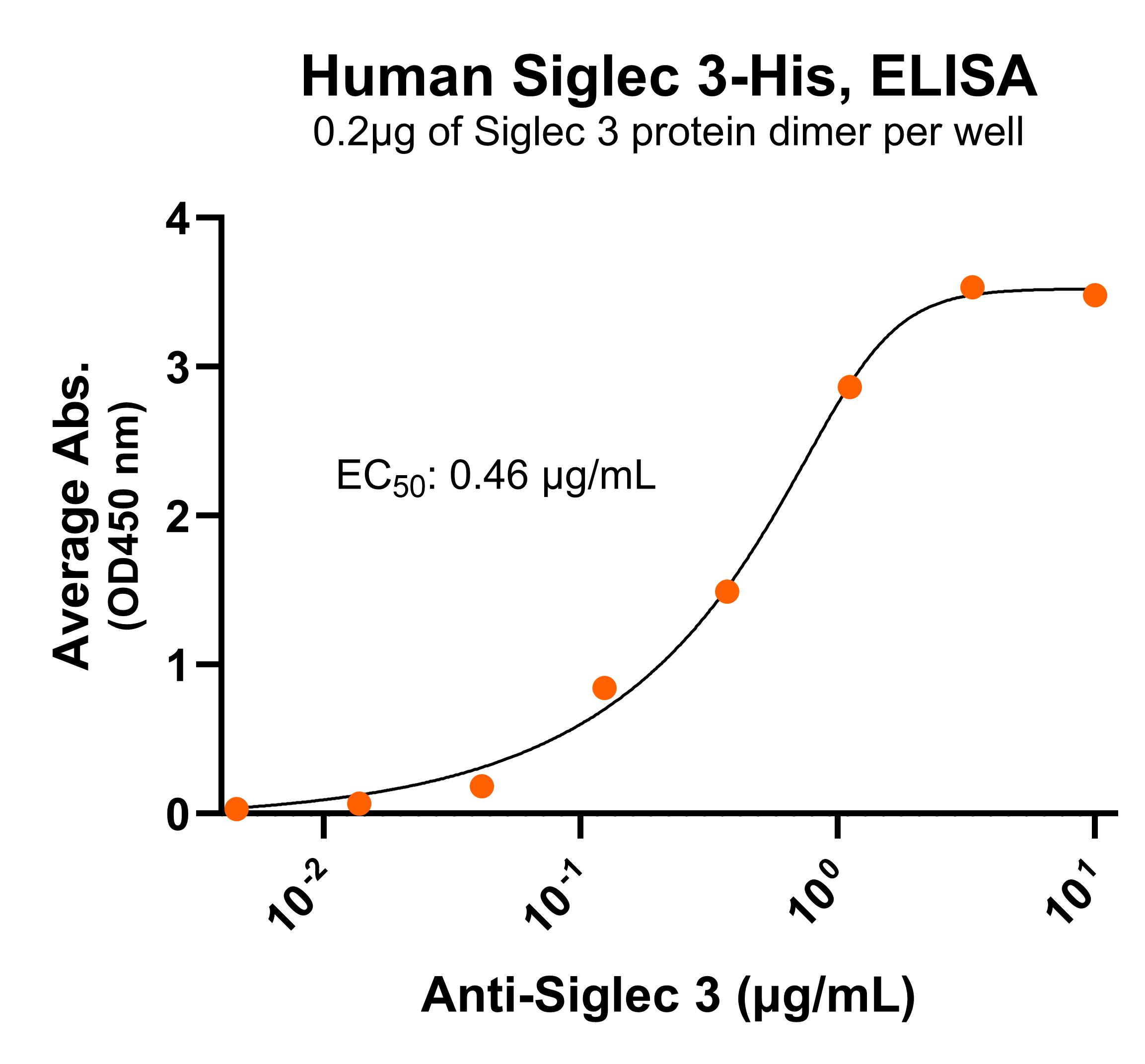 Immobilized human Siglec 3 protein dimer, His Tag (CSP-25200-01) at 2 μg/mL (100 μL/well) can bind anti-human Siglec 3 monoclonal antibody with half maximal effective concentration (EC50) range of 0.23-0.91 μg/mL (QC tested).For Research Use Only (RUO)
