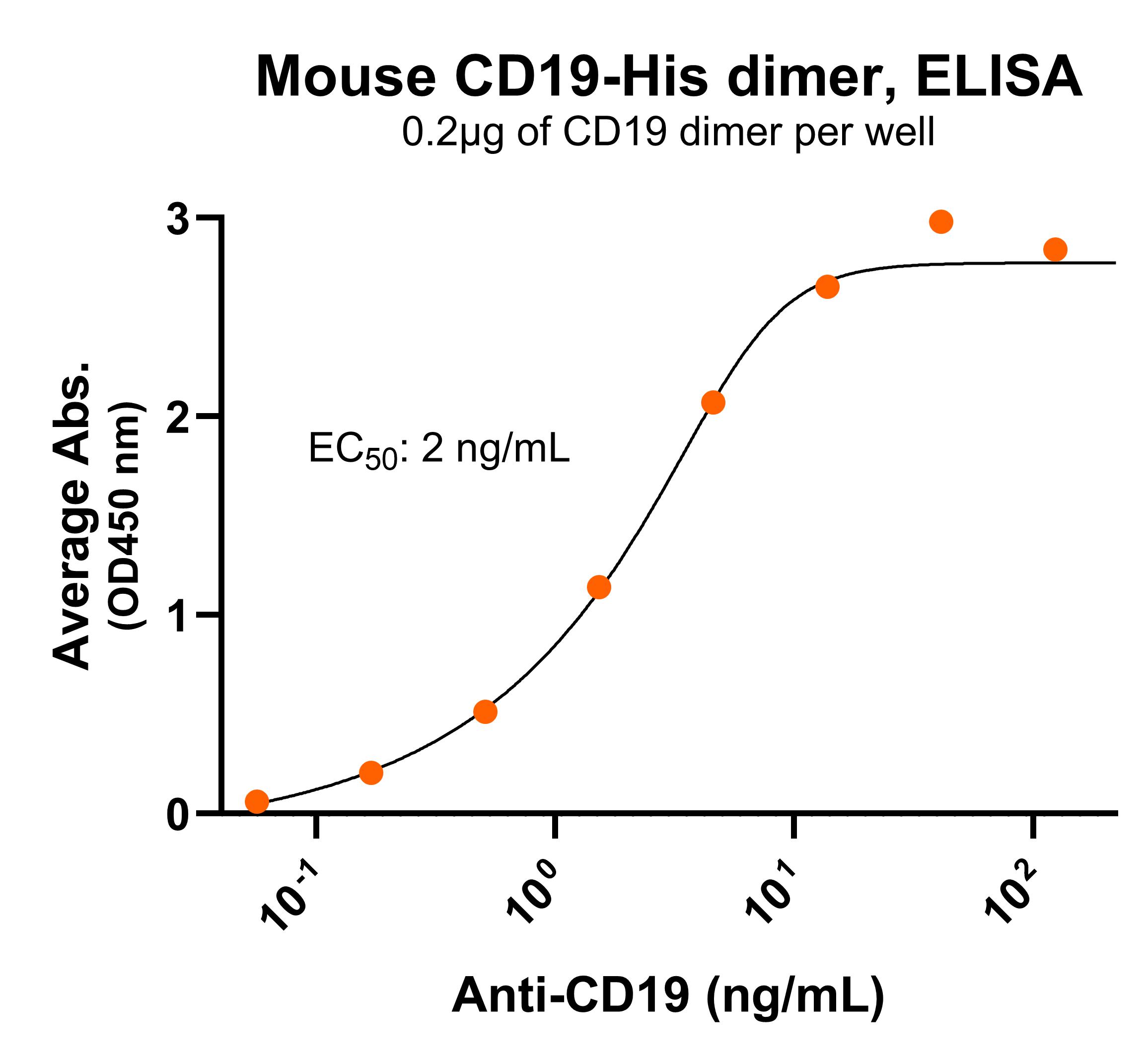 Immobilized mouse CD19-His dimer protein (CSP-124-01) at 2 μg/mL (100 μL/well) can bind anti-mouse CD19 monoclonal antibody with half maximal effective concentration (EC50) range of 1-4 ng/mL (QC tested).For Research Use Only (RUO)