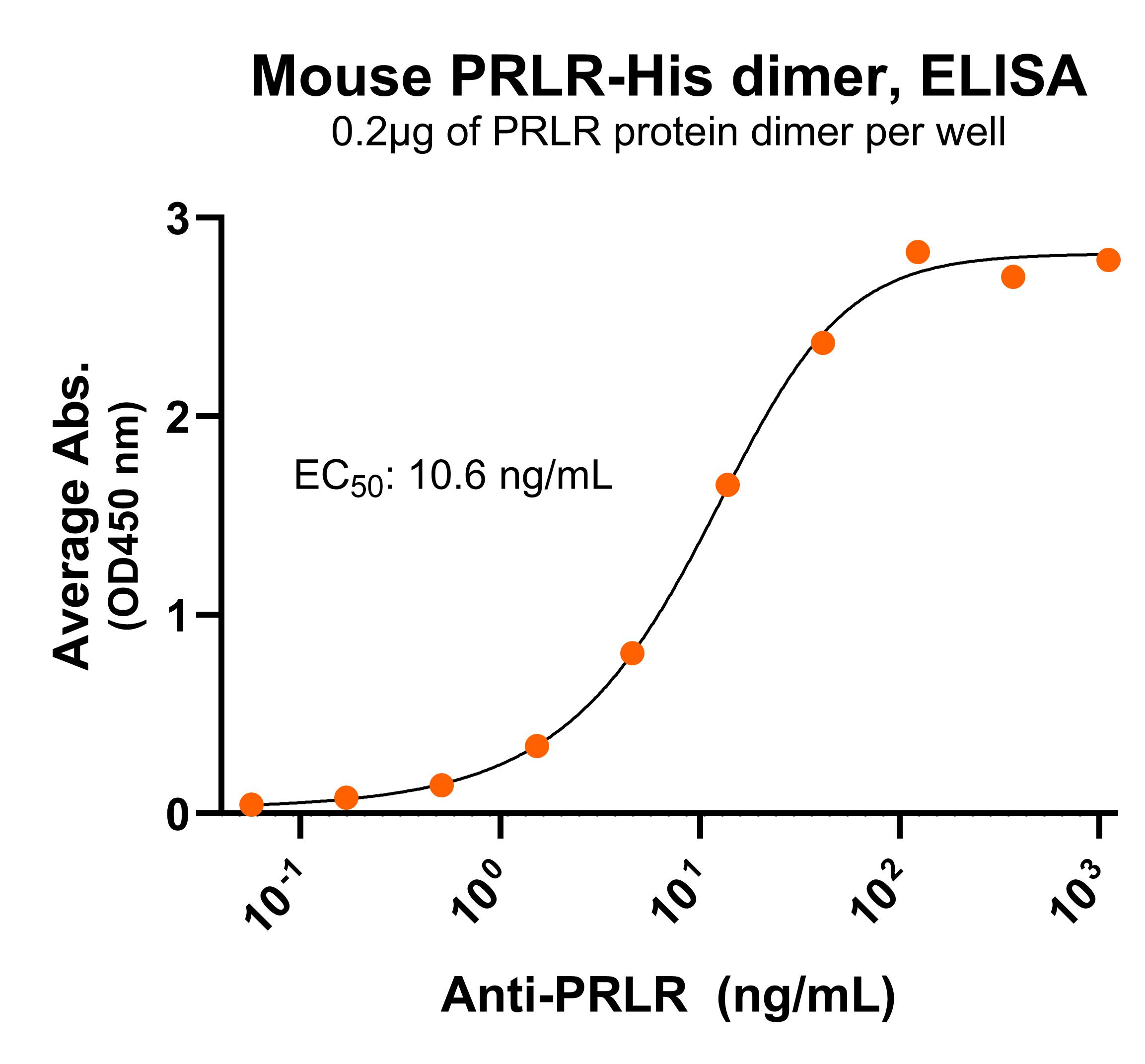 Immobilized mouse PRLR protein dimer, His-tag (CSP-25160-01) at 2 μg/mL (100 μL/well) can bind anti-mouse PRLR monoclonal antibody with half maximal effective concentration (EC50) range of 5.3-21.2 ng/mL (QC tested).For Research Use Only (RUO)